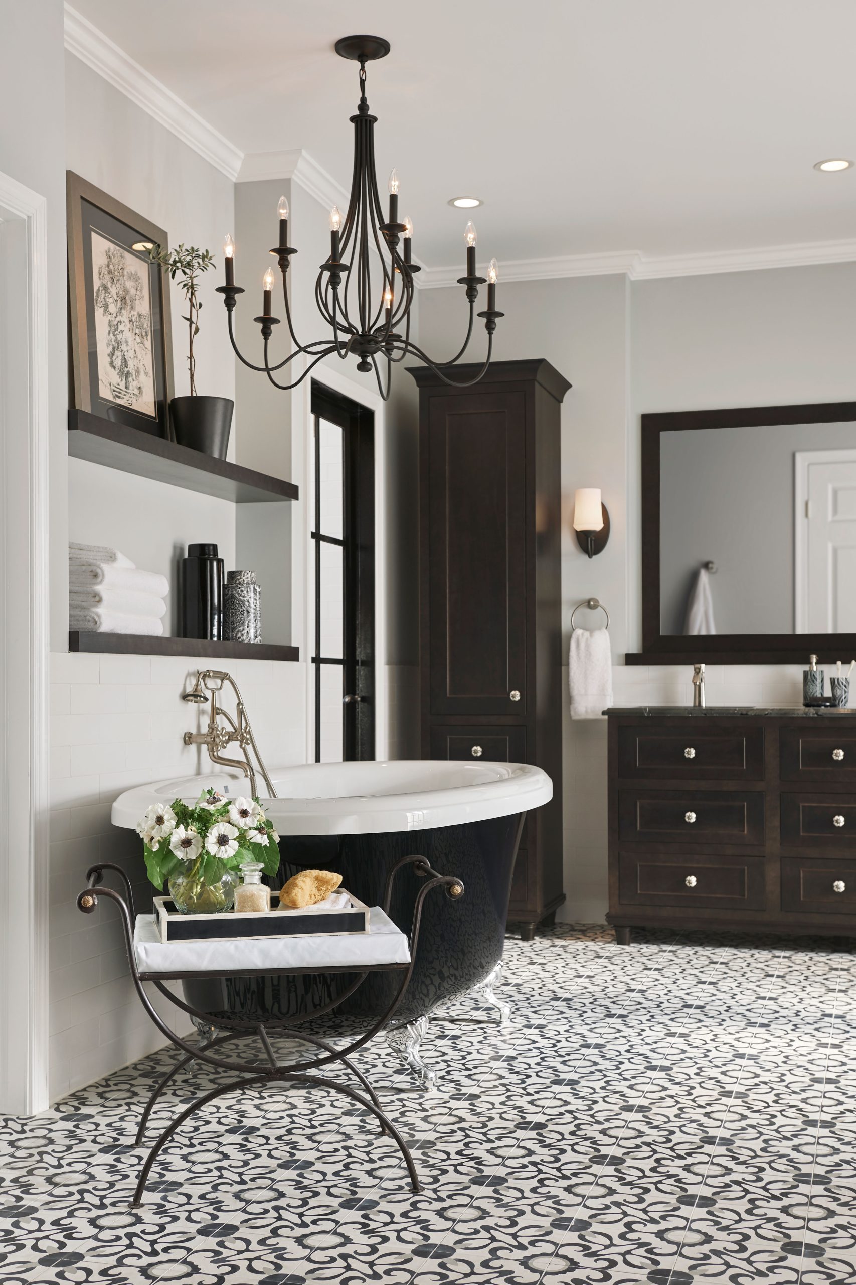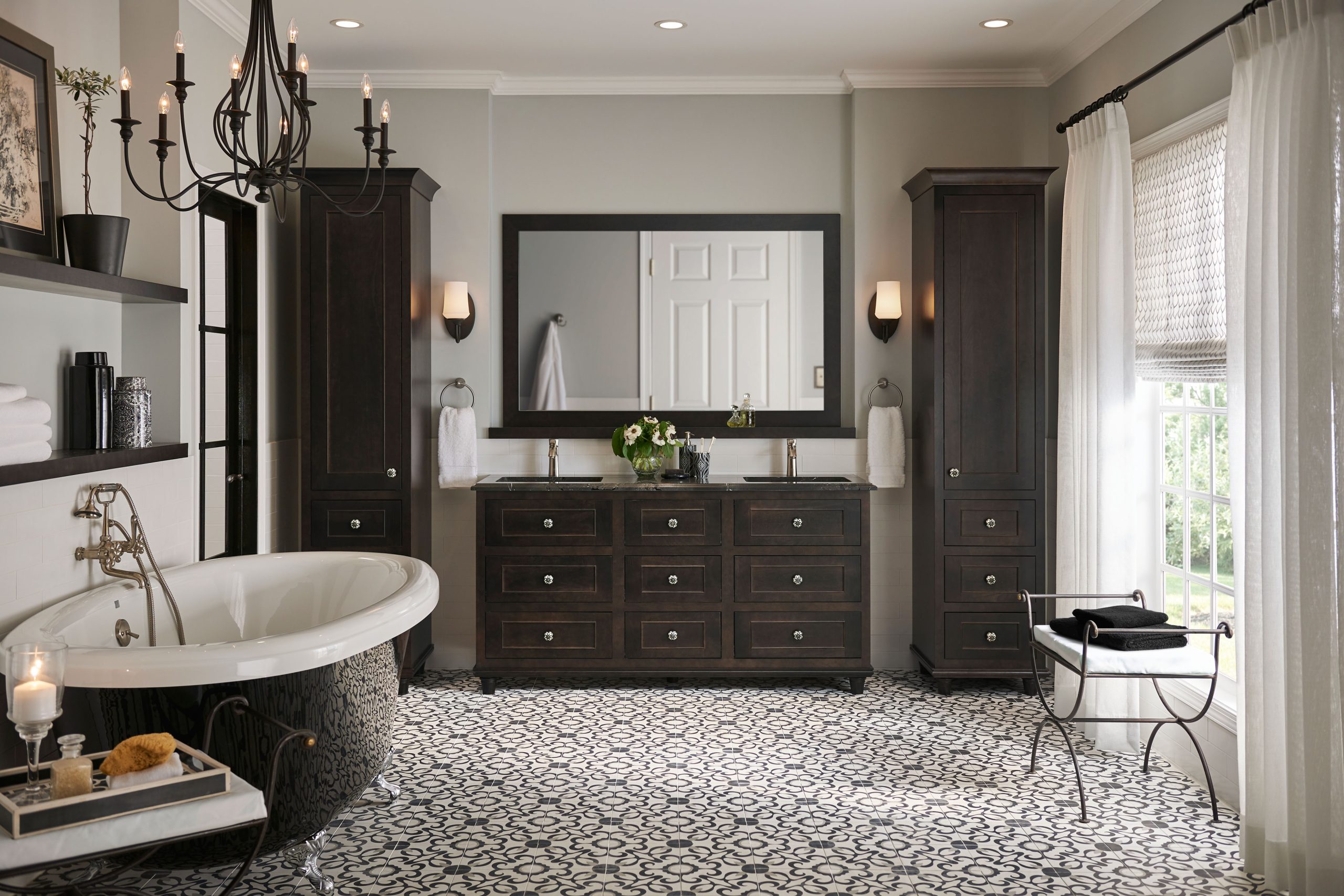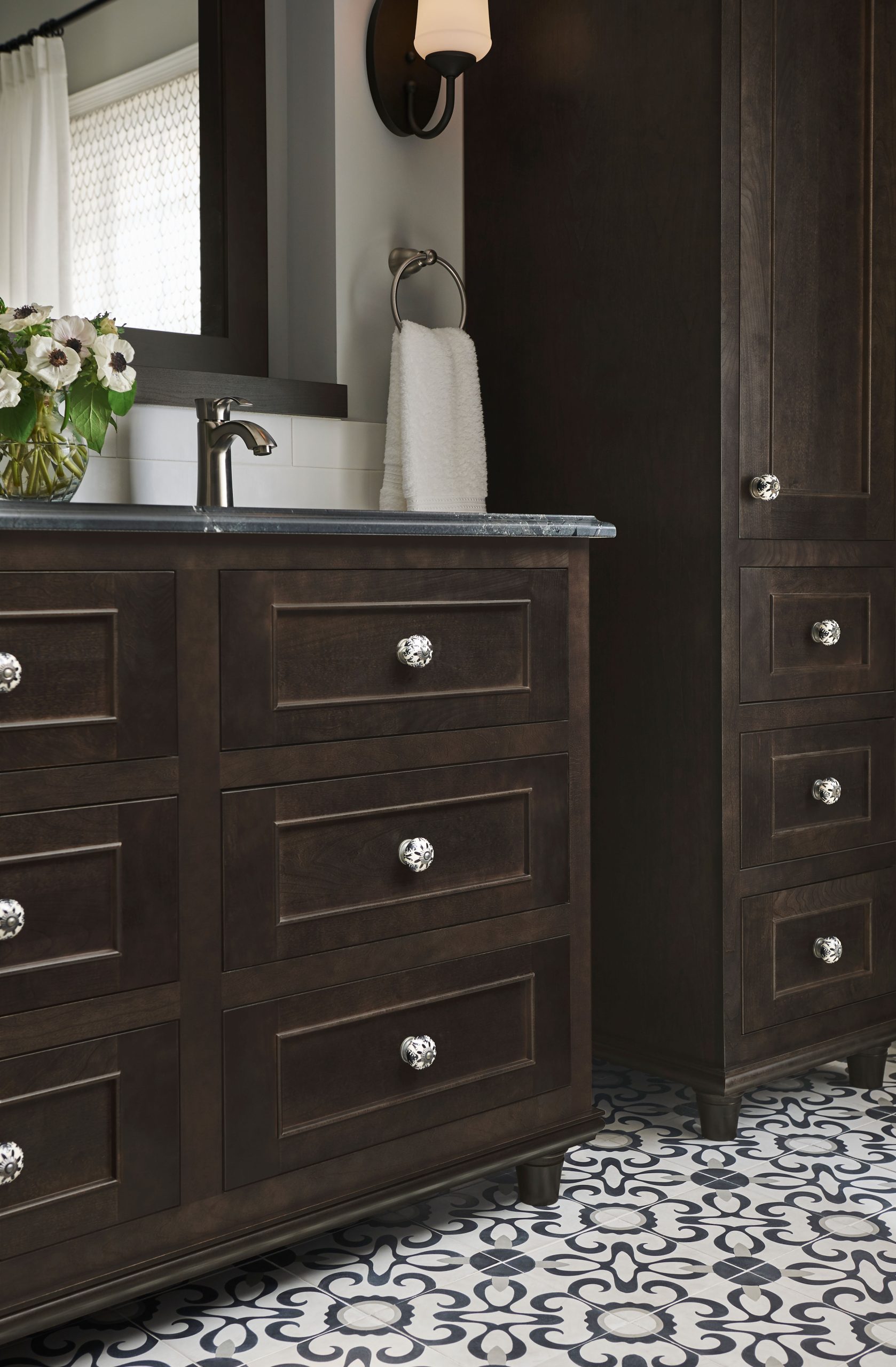 We paired our rich, deep Smoke finish with vintage  patterned tile for a striking contrast. Complete the set  with a matching mirror, linen cabinets, and open shelves.