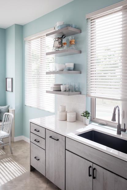 EVERYTHING WITHIN REACH | Open shelving keeps everyday essentials at your fingertips and custom drawer organizers conceal the rest for an uncluttered feel, even when space is at a minimum.