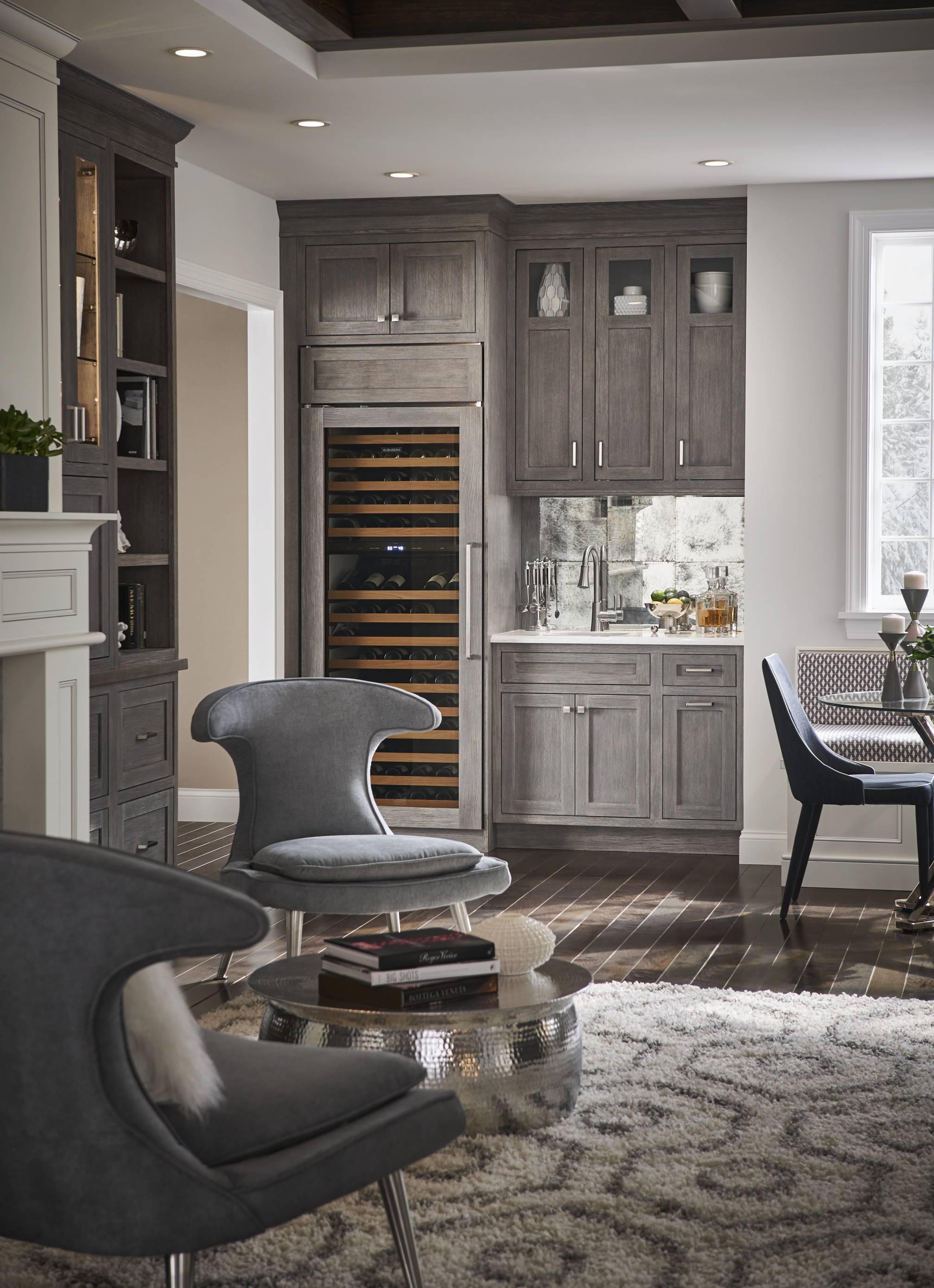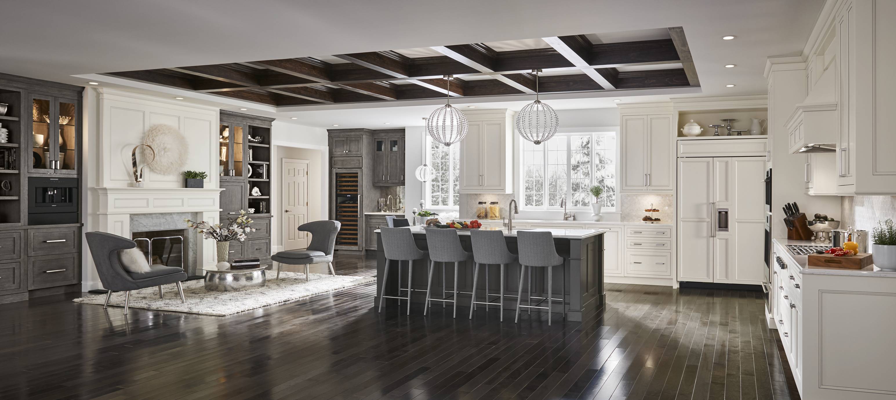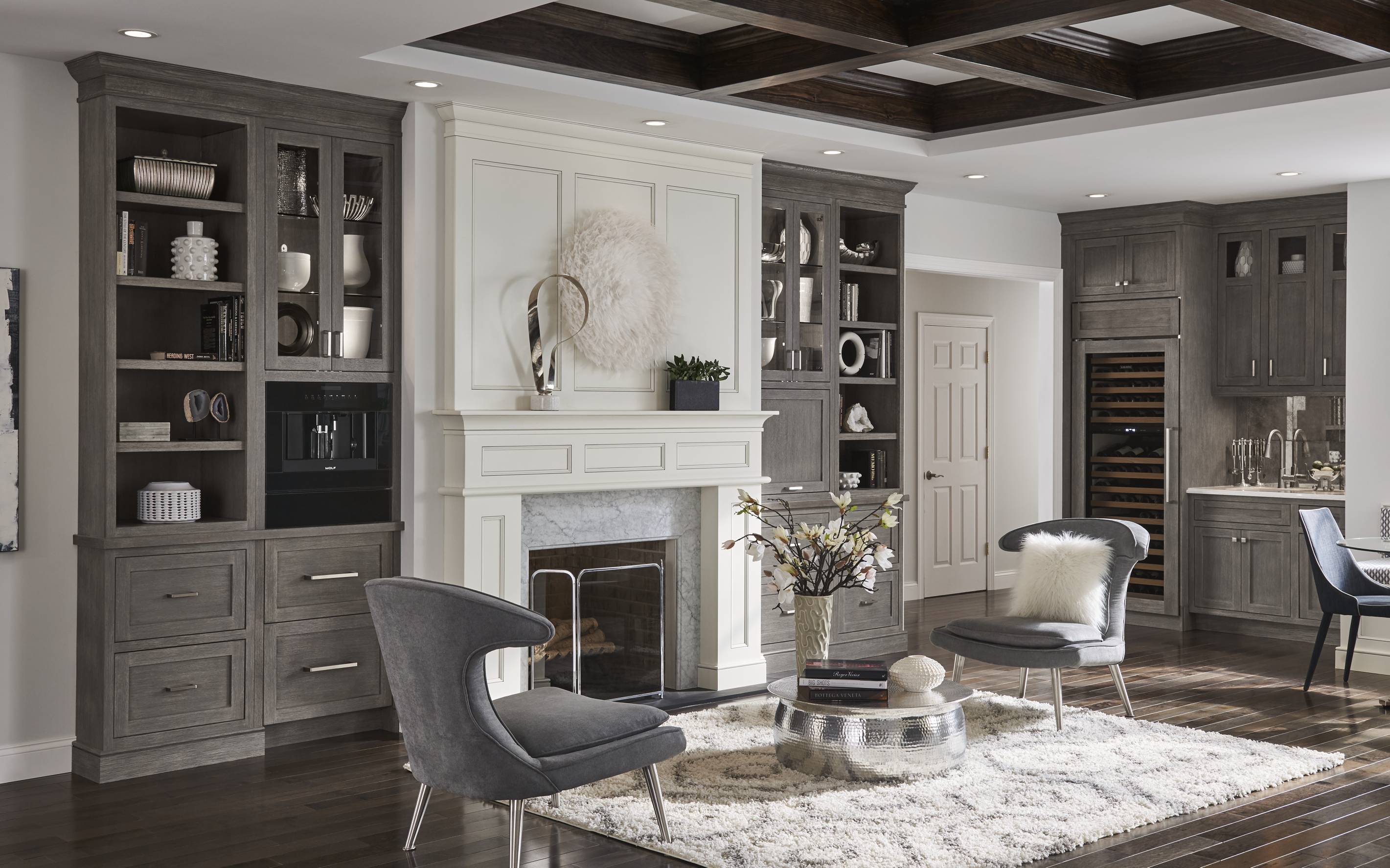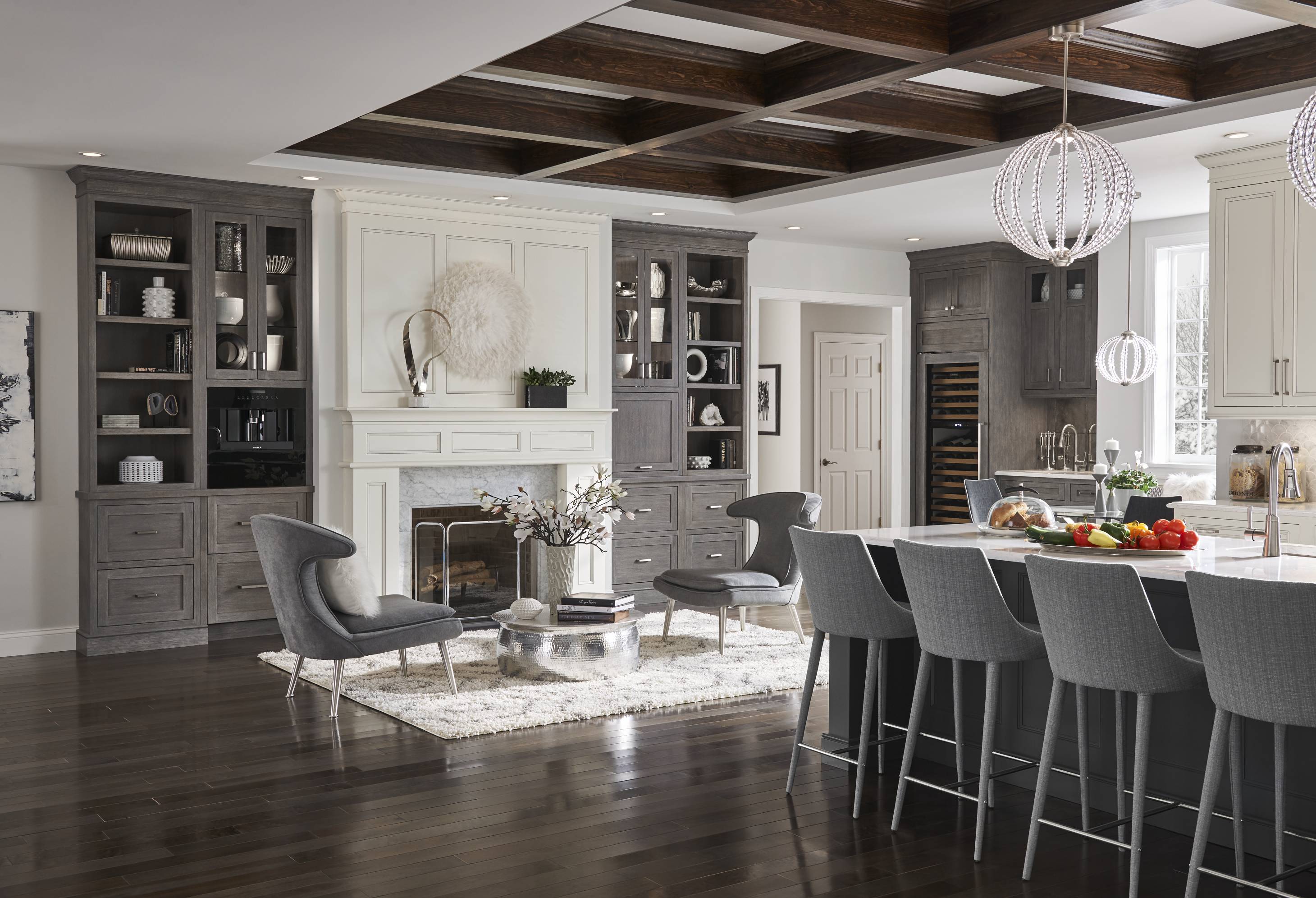 Classic white Divinity contrasts with deep Earl Grey throughout the space. We love how accents of silvery Boulder on the built-in bookshelves and wet bar add dimension and texture, while a custom mantelpiece in a matching finish ties the family room and kitchen together.