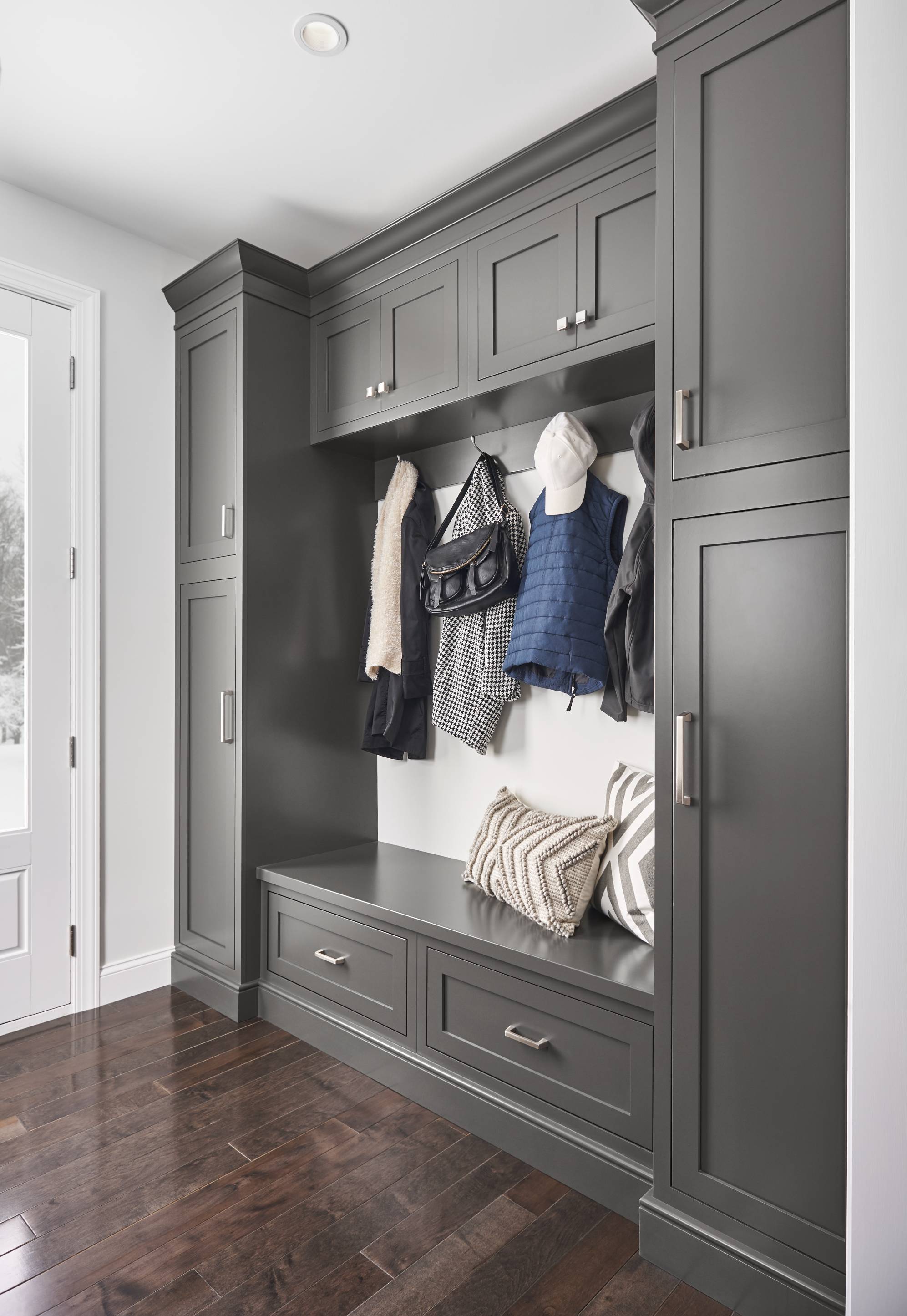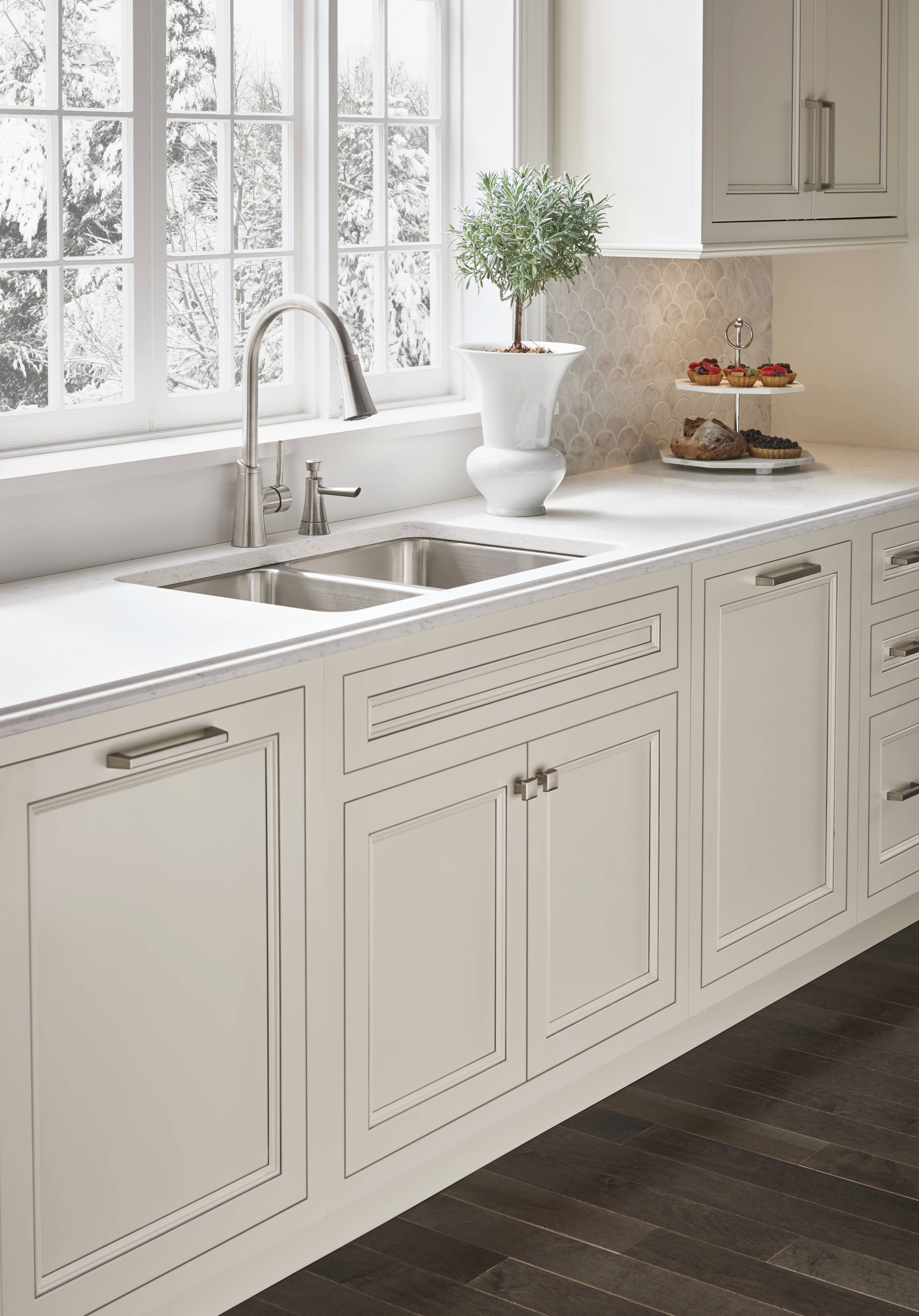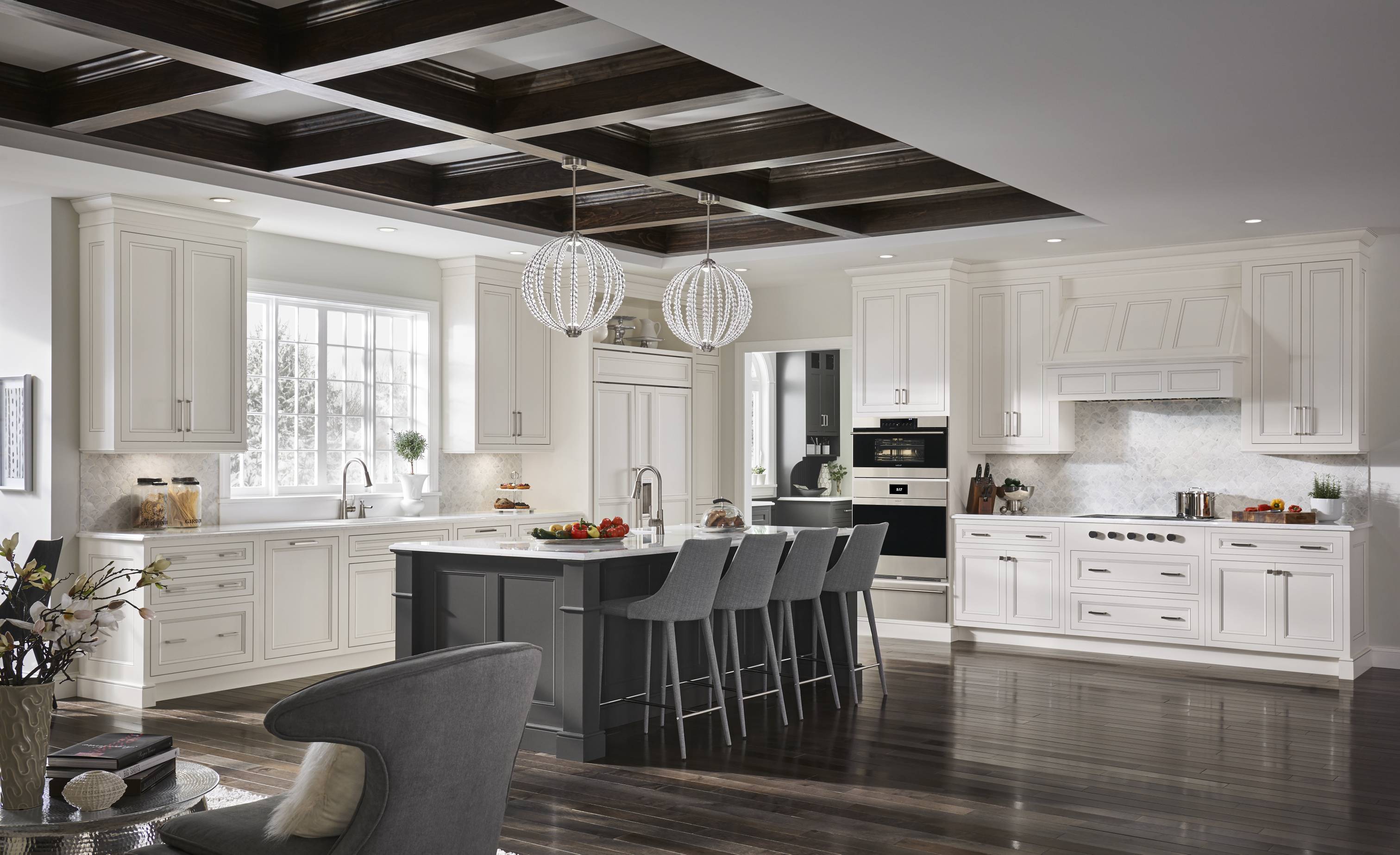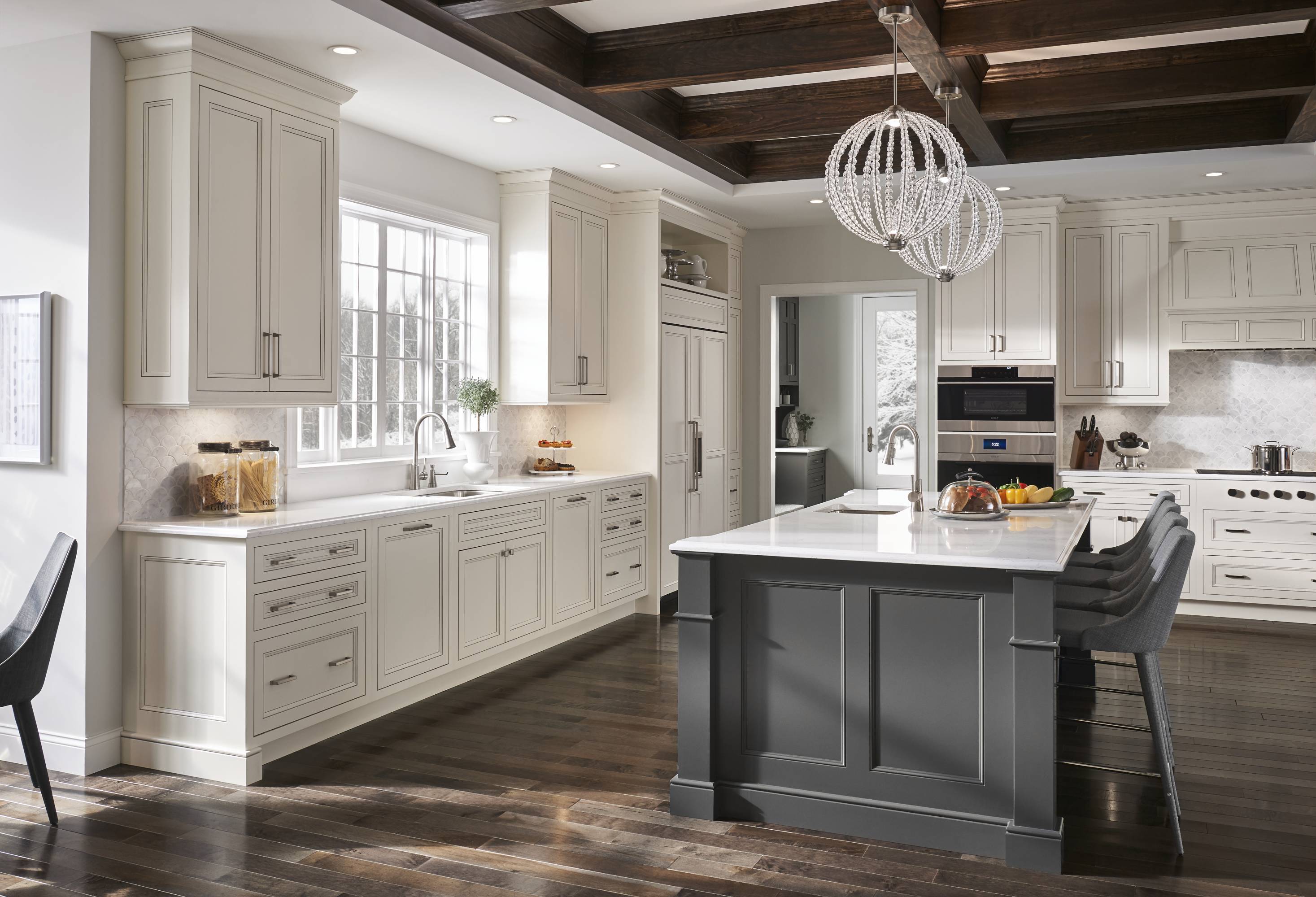 Classic white Divinity contrasts with deep Earl Grey throughout the space. We love how accents of silvery Boulder on the built-in bookshelves and wet bar add dimension and texture, while a custom mantelpiece in a matching finish ties the family room and kitchen together.