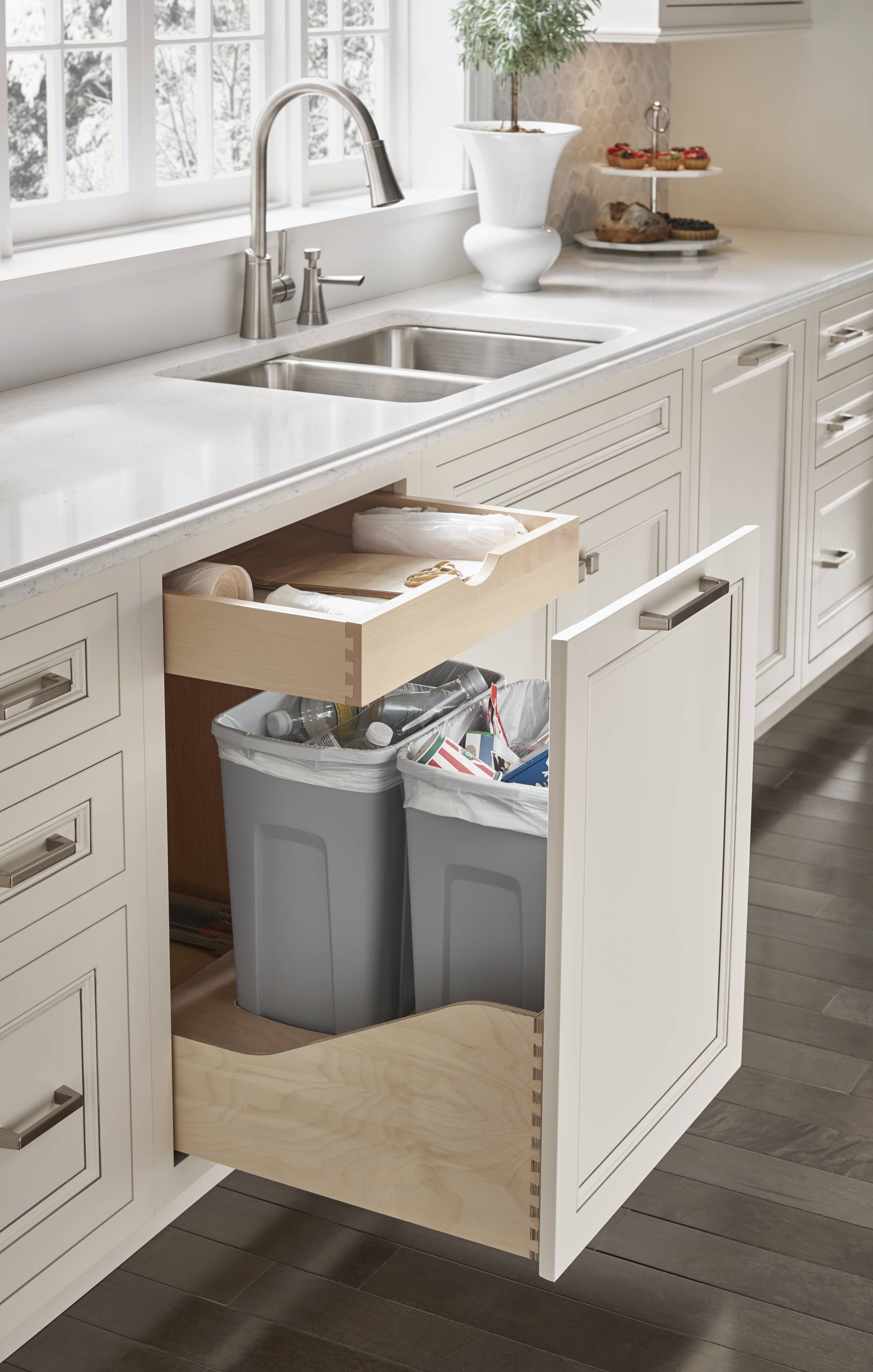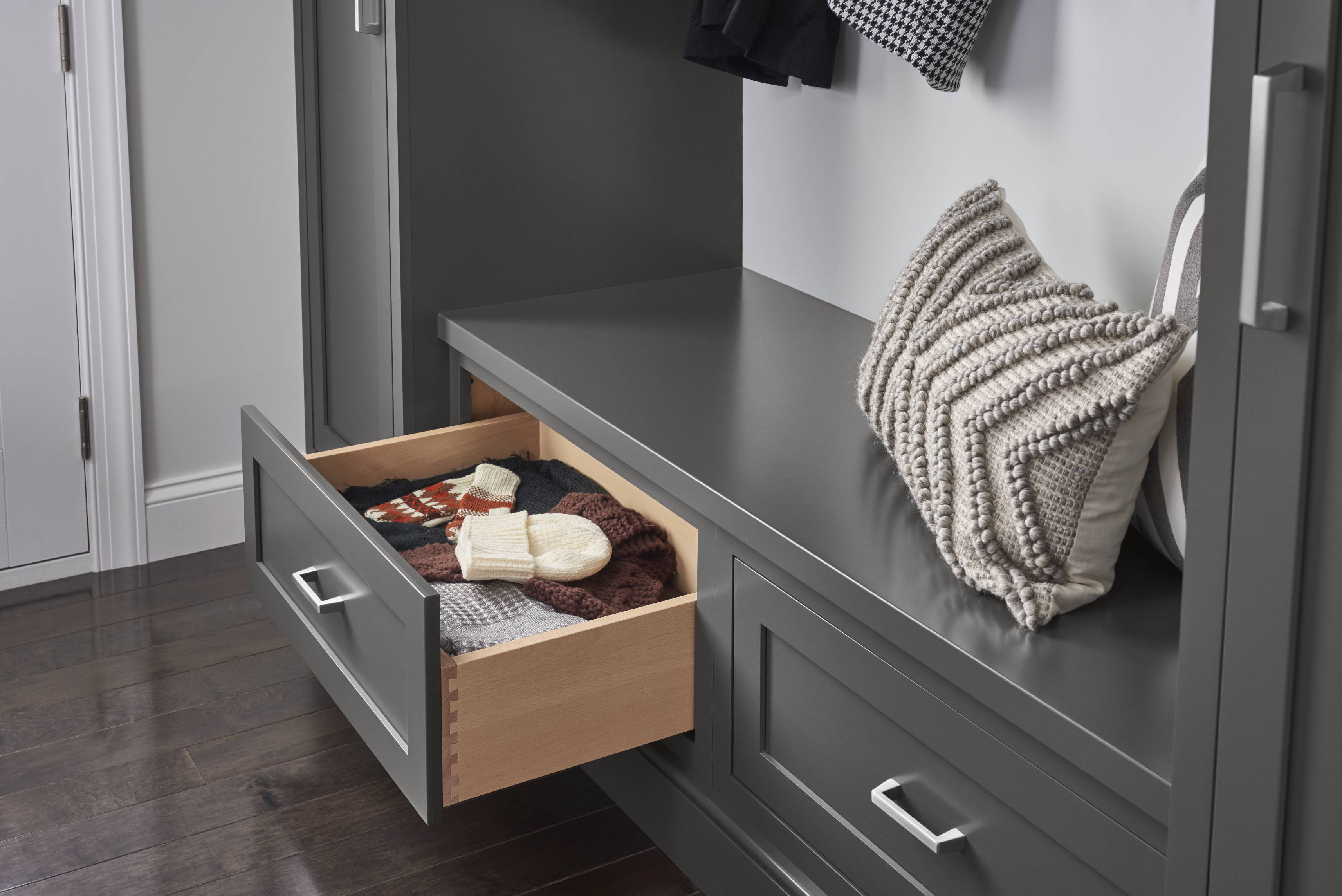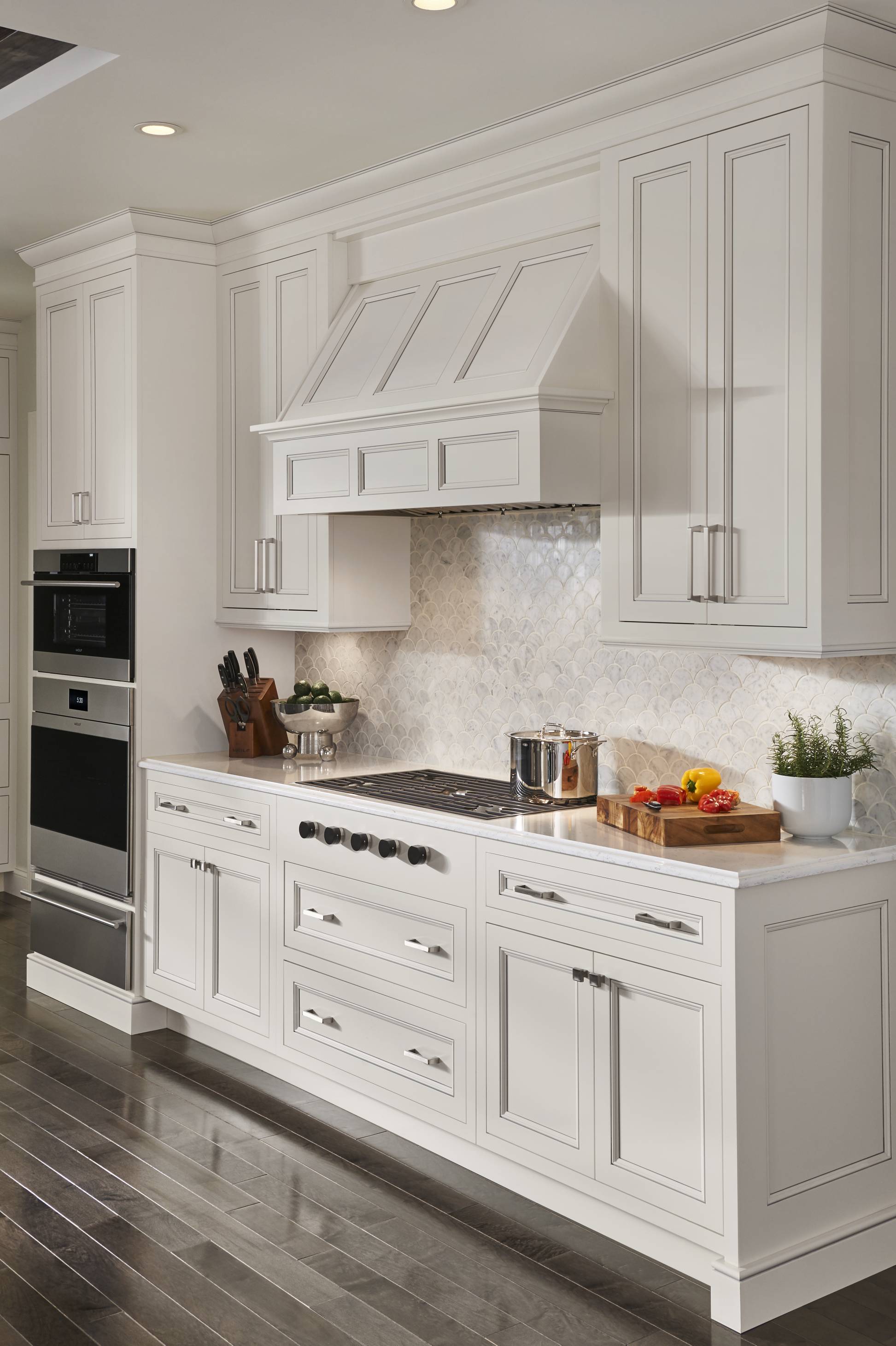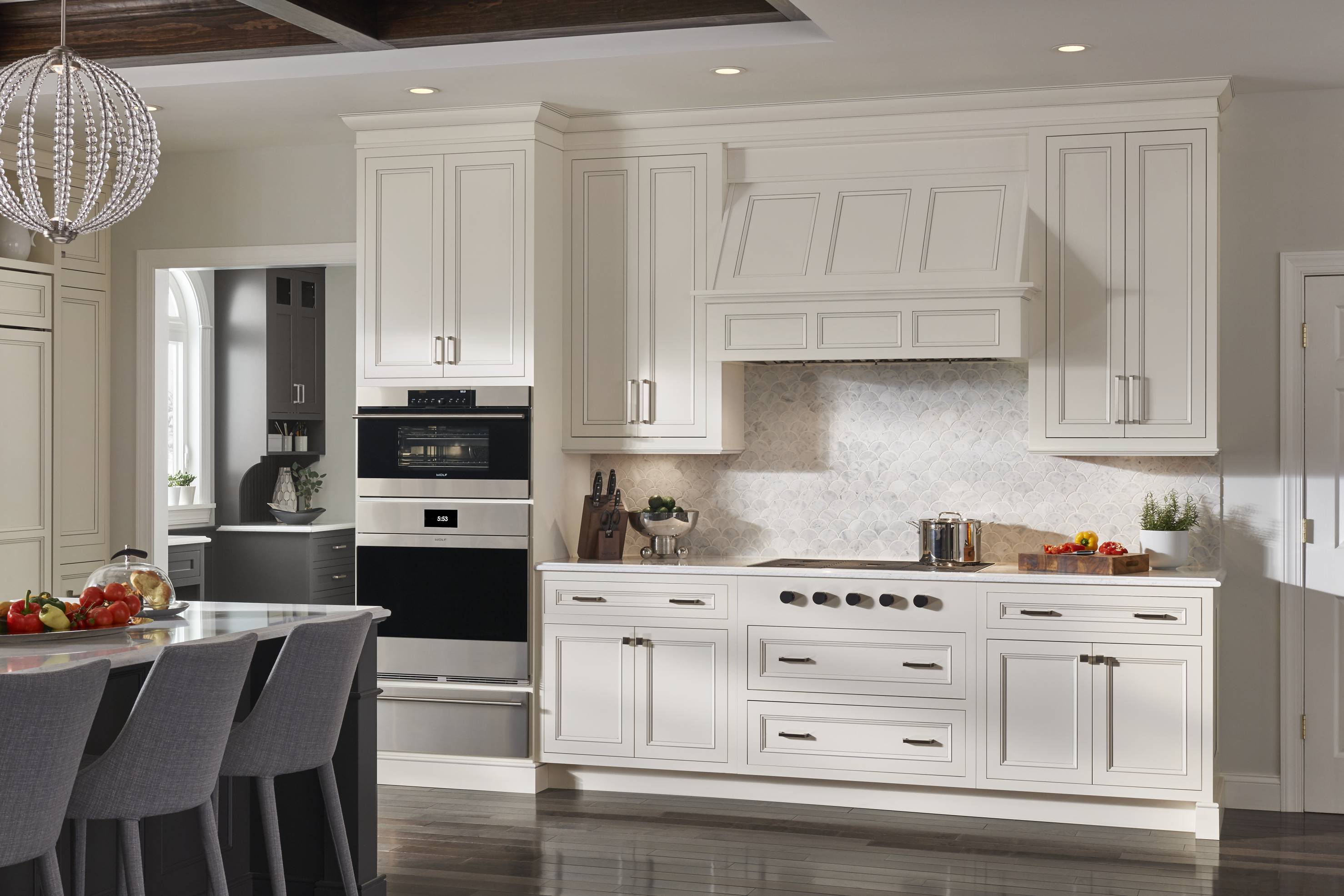 Classic white Divinity contrasts with deep Earl Grey throughout the space. We love how accents of silvery Boulder on the built-in bookshelves and wet bar add dimension and texture, while a custom mantelpiece in a matching finish ties the family room and kitchen together.