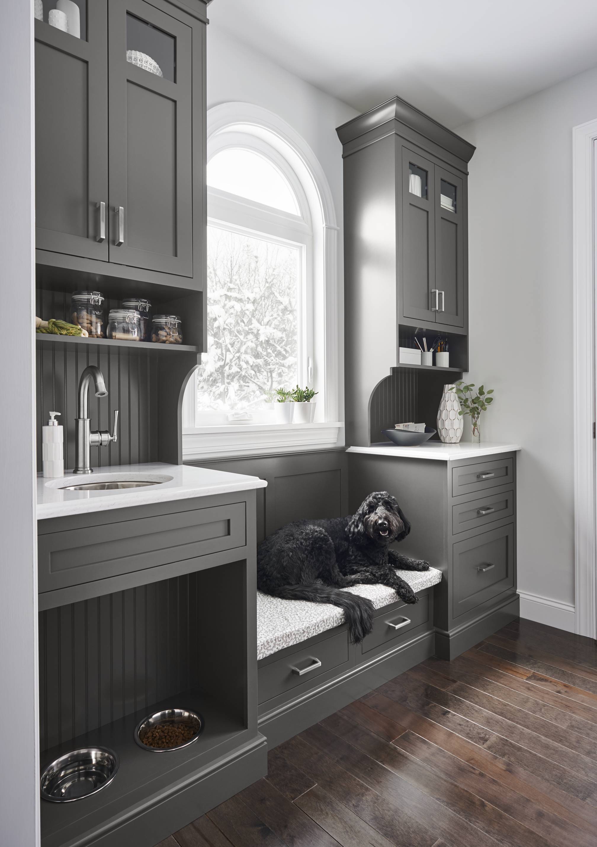 Snuggle in for a cup of cocoa on a quiet winter afternoon in a warm and serene living space. Even your canine companion has a cozy place of her own!