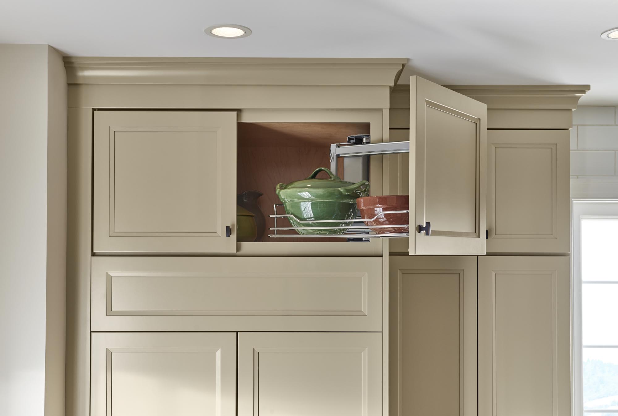 This clever tray swings out of high kitchen cabinets like the ones above refrigerators and other appliances to make the most of every inch of cabinet space.