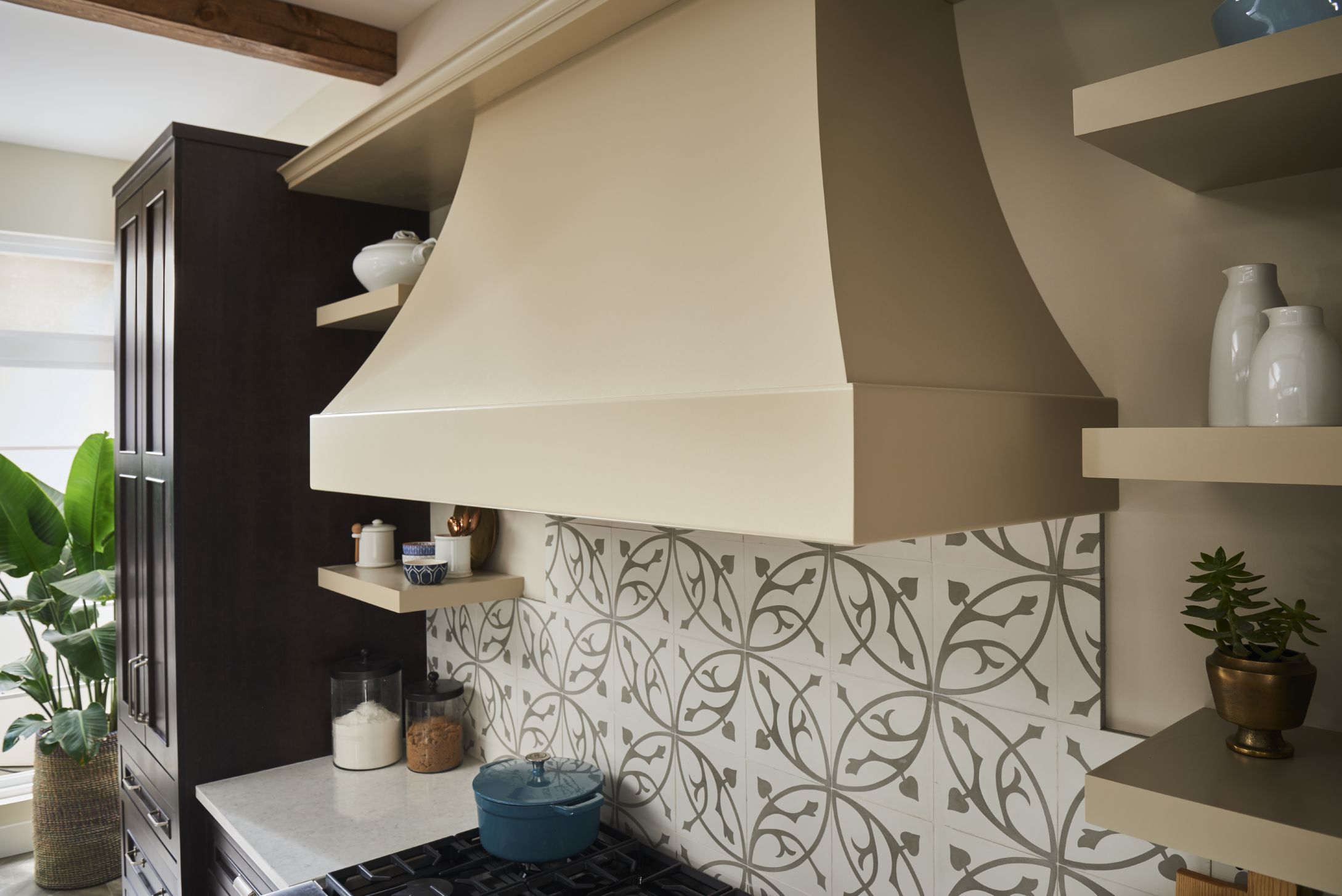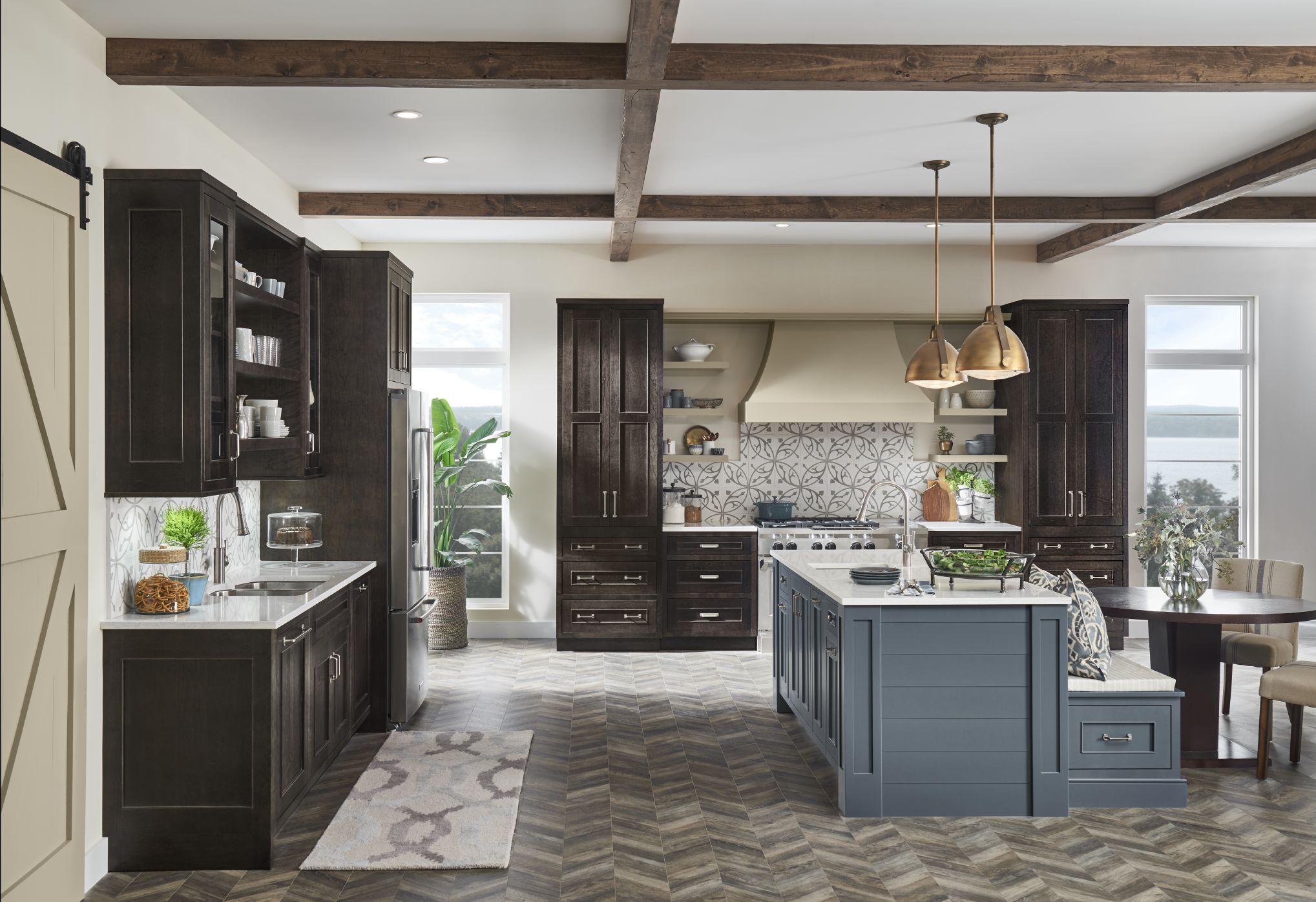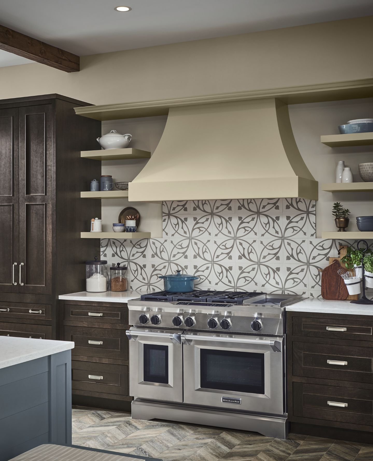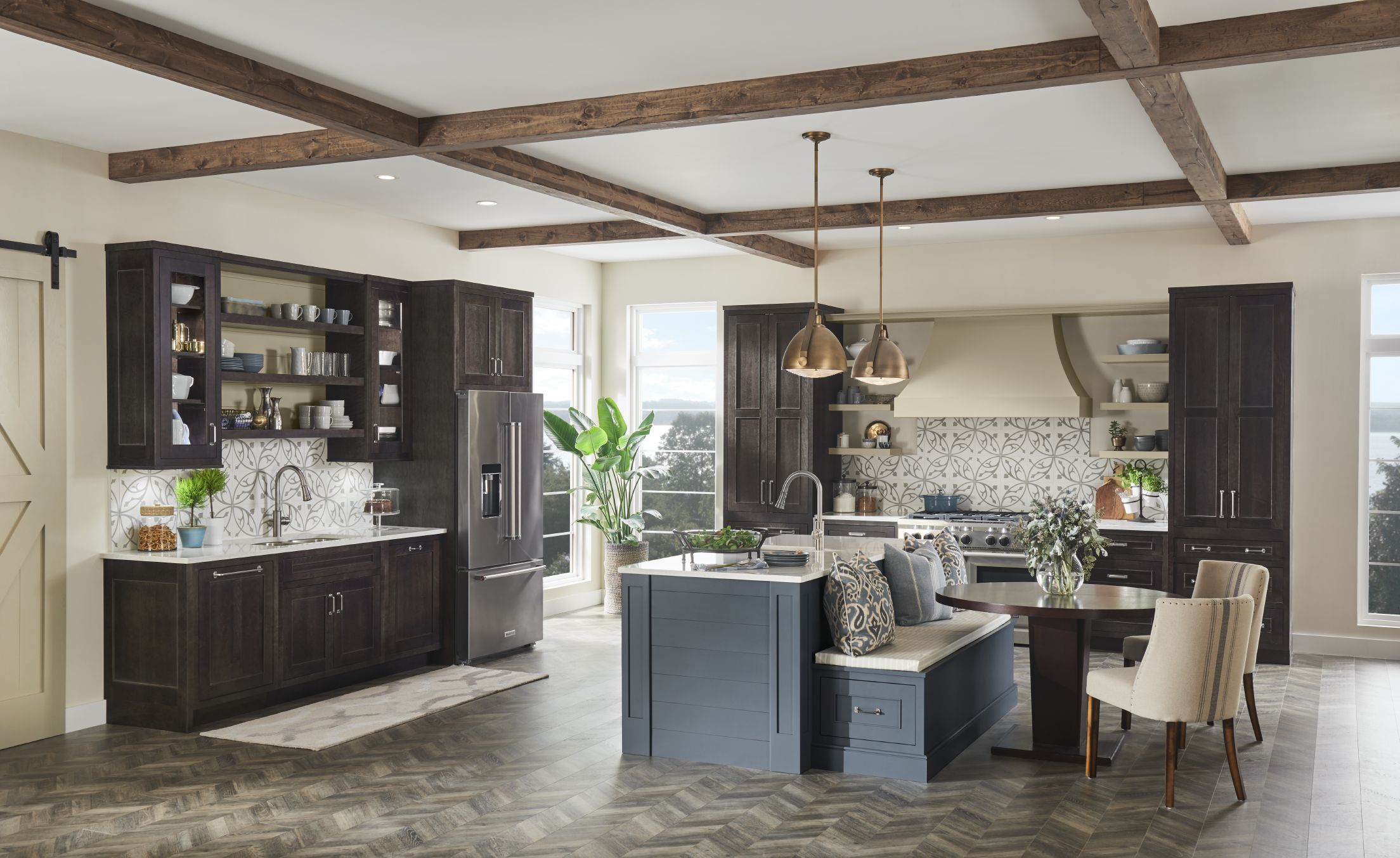 Creating a comfortable yet chic kitchen is all about balance. In this design, the clean-lined hood, open shelves, and minimal Logan doors contribute to a contemporary, airy feel. The design is grounded by an earth-toned palette of blue, beige, and brown and organic elements such as the driftwood-inspired flooring and exposed wood beams.