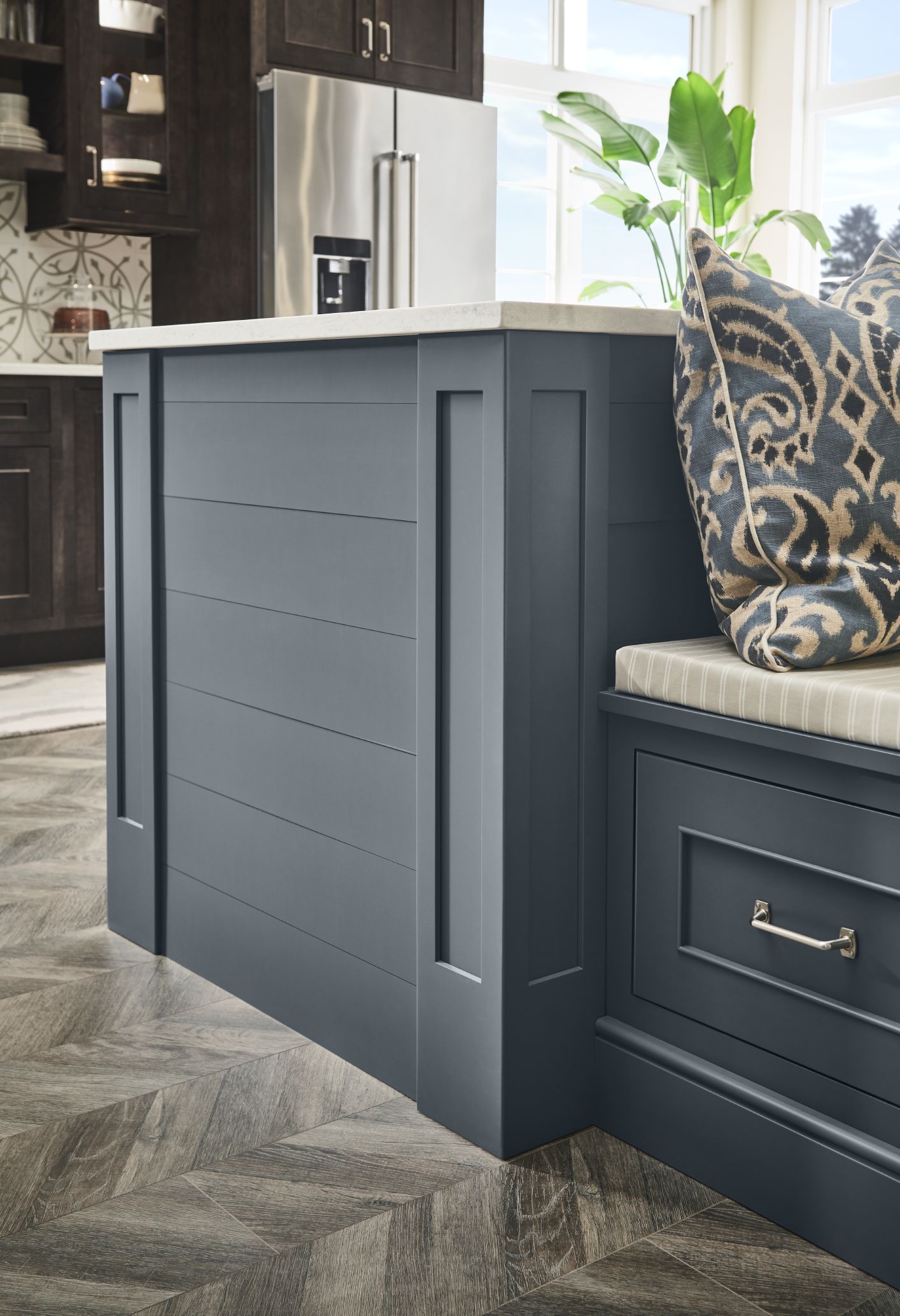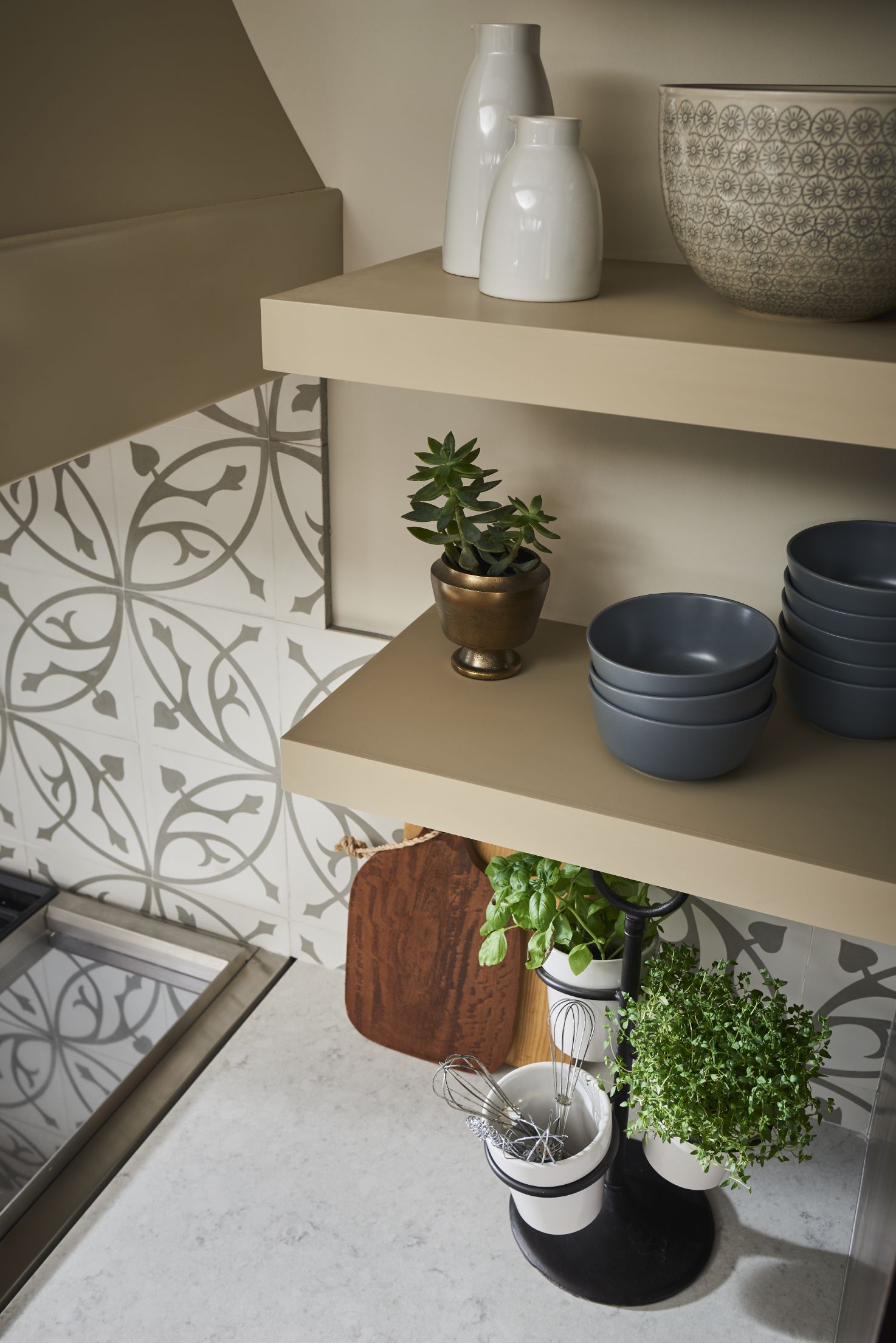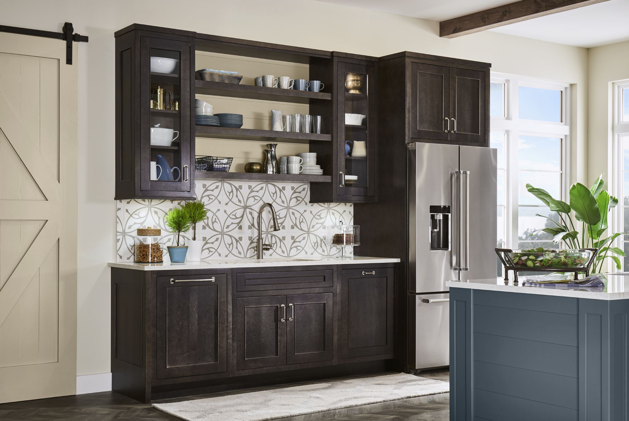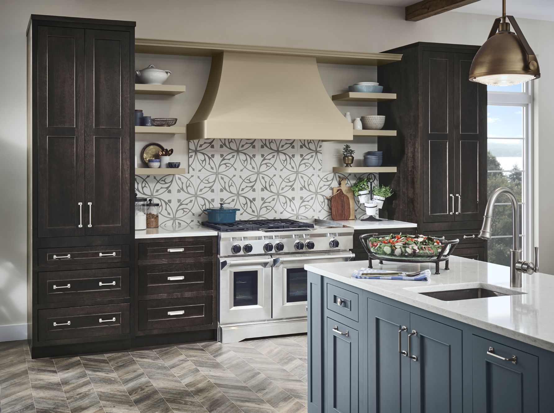 Creating a comfortable yet chic kitchen is all about balance. In this design, the clean-lined hood, open shelves, and minimal Logan doors contribute to a contemporary, airy feel. The design is grounded by an earth-toned palette of blue, beige, and brown and organic elements such as the driftwood-inspired flooring and exposed wood beams.