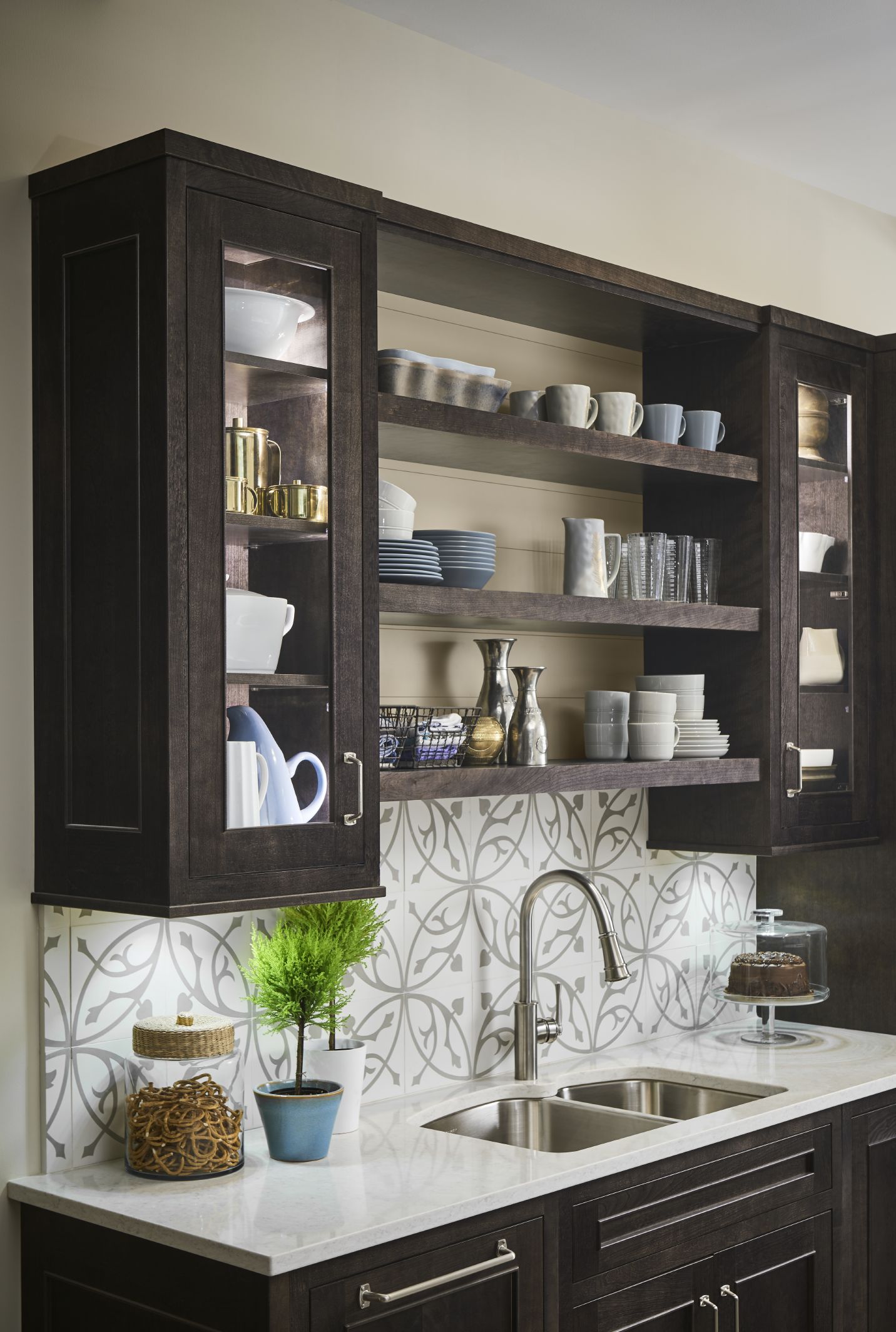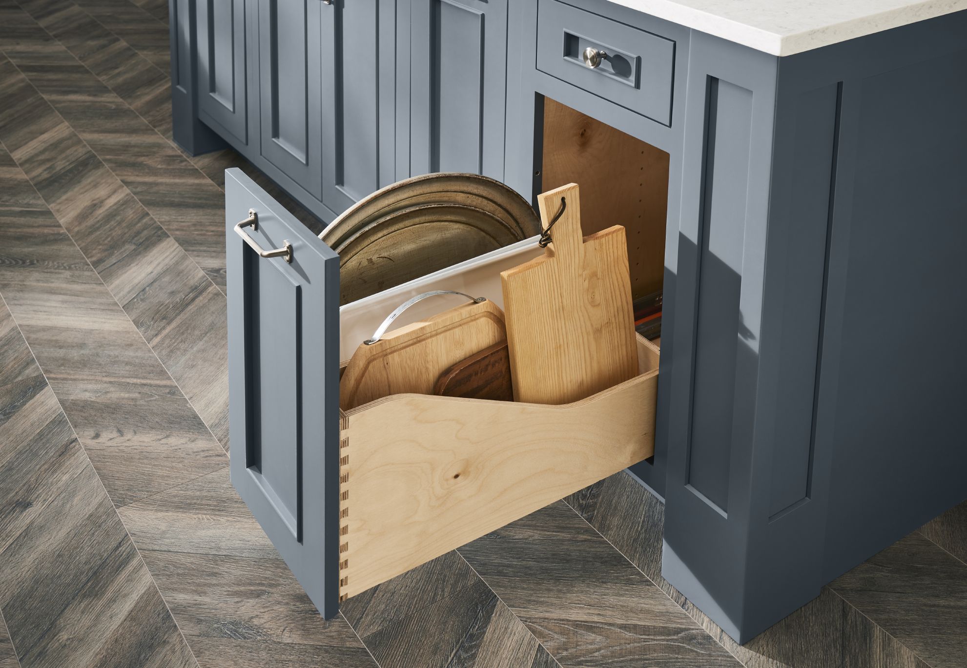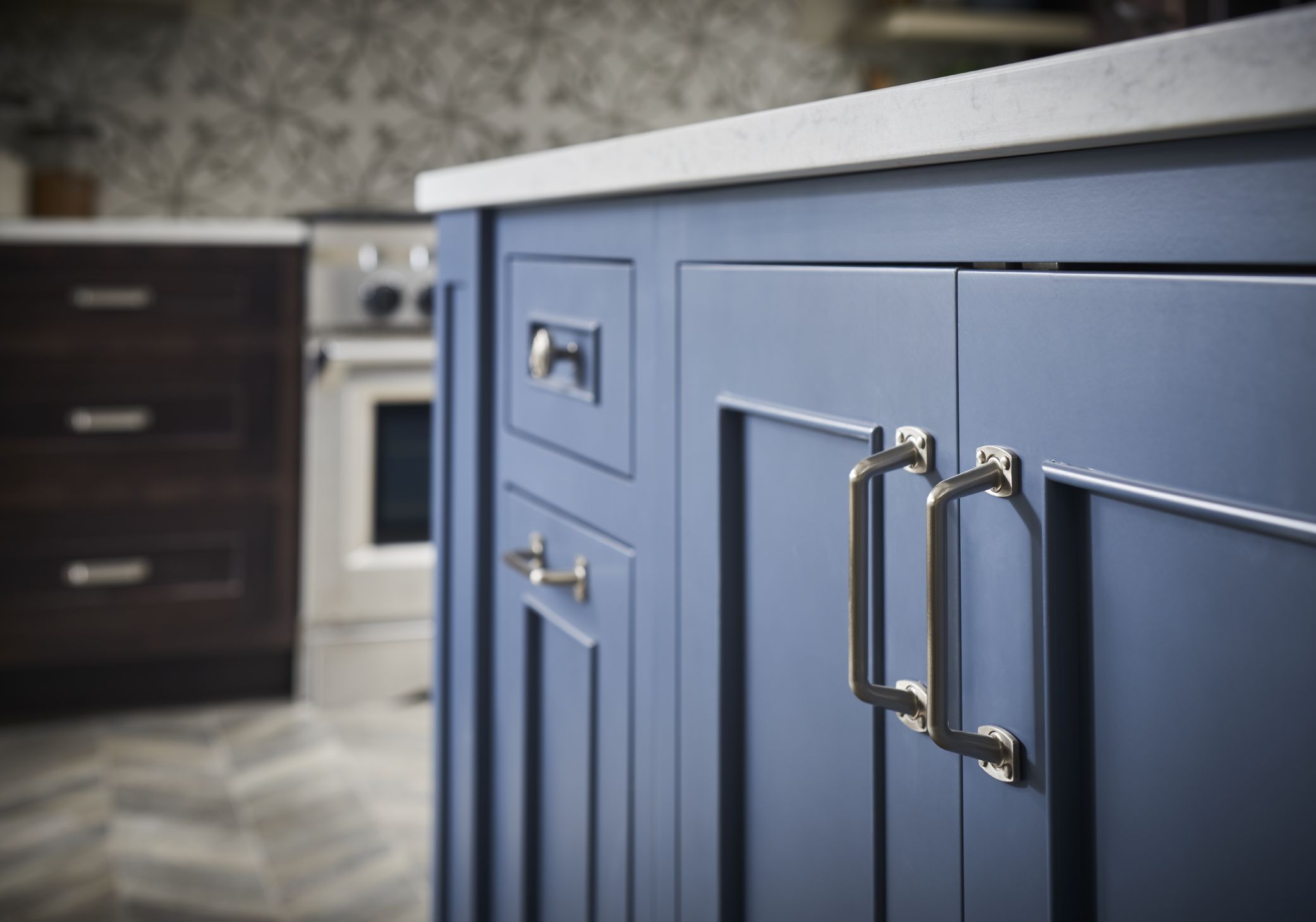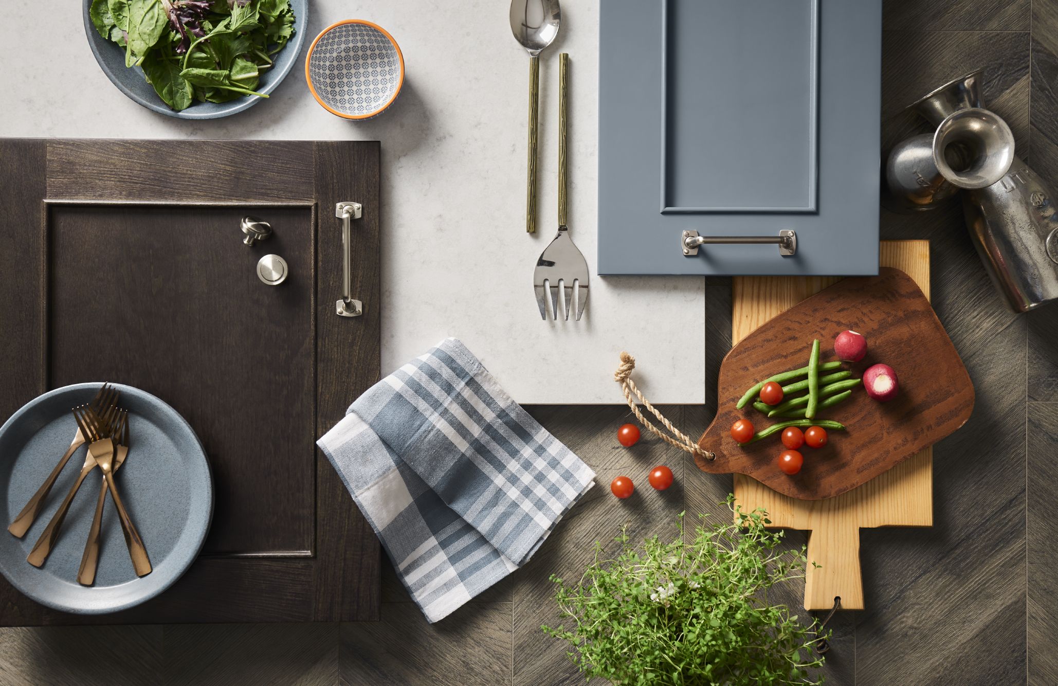 Creating a comfortable yet chic kitchen is all about balance. In this design, the clean-lined hood, open shelves, and minimal Logan doors contribute to a contemporary, airy feel. The design is grounded by an earth-toned palette of blue, beige, and brown and organic elements such as the driftwood-inspired flooring and exposed wood beams.