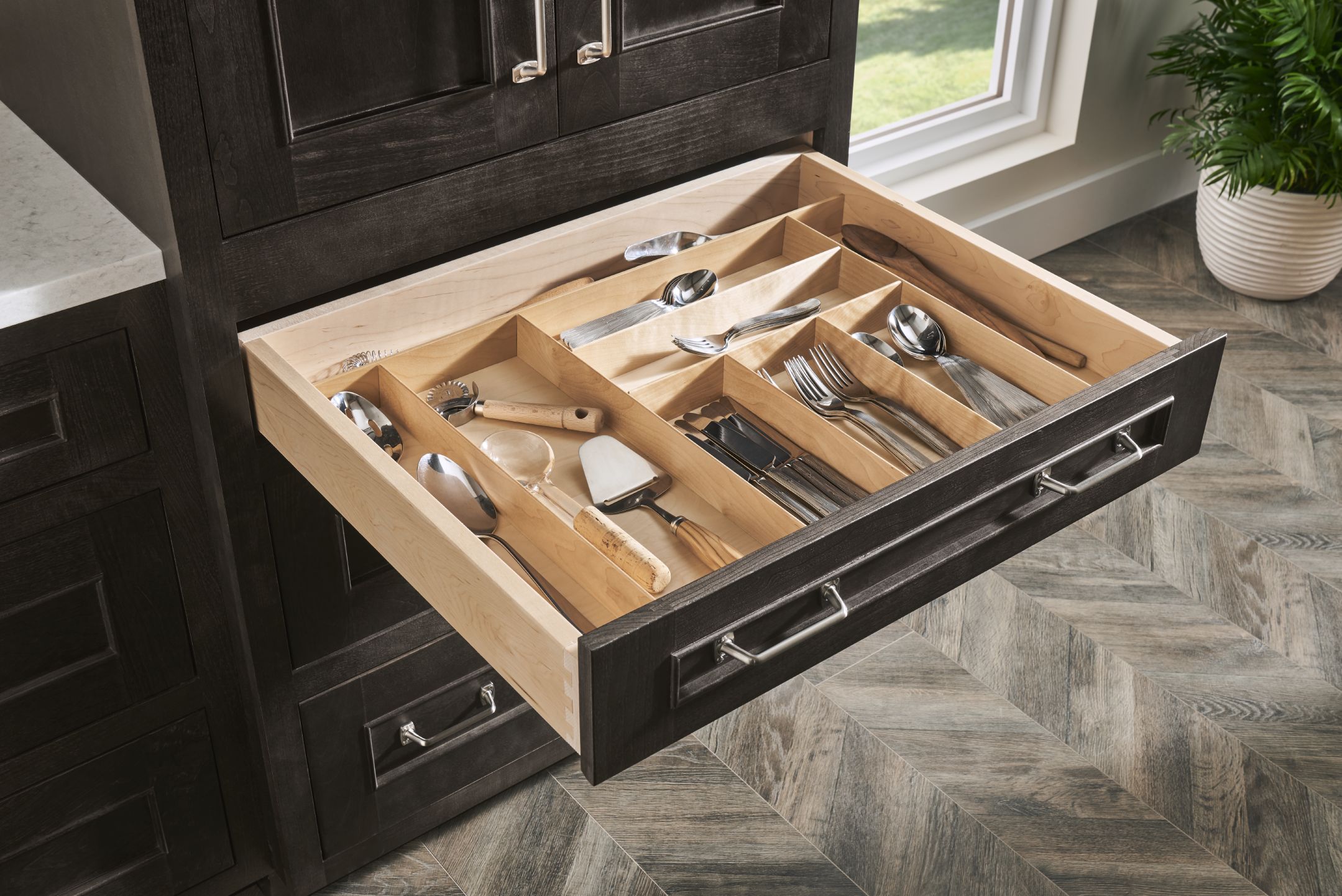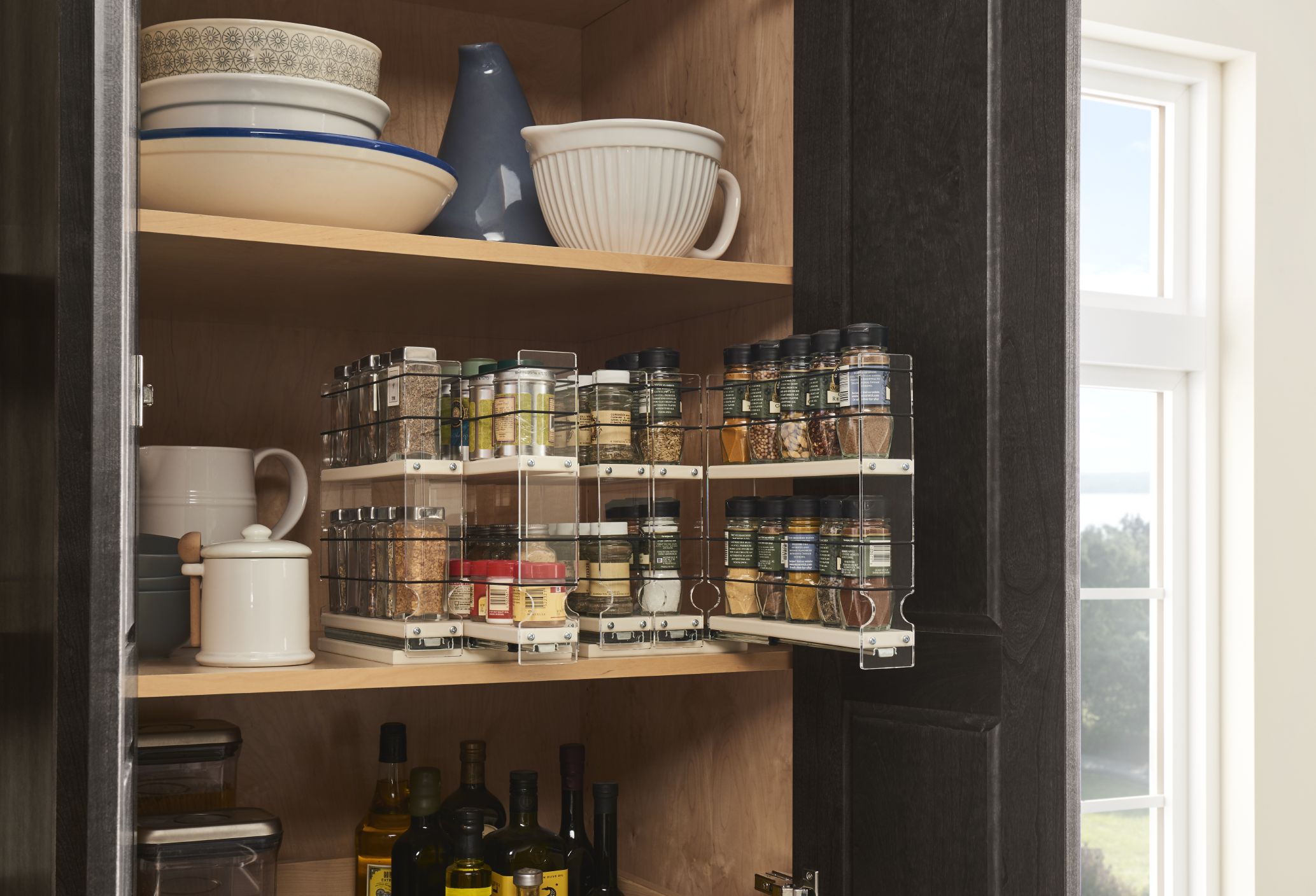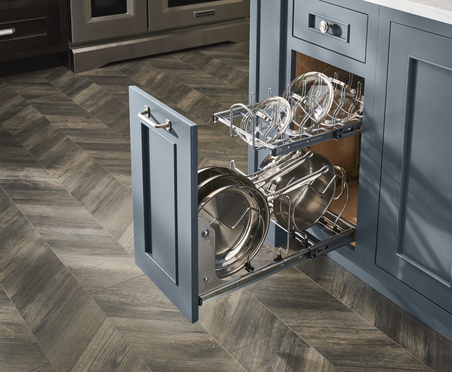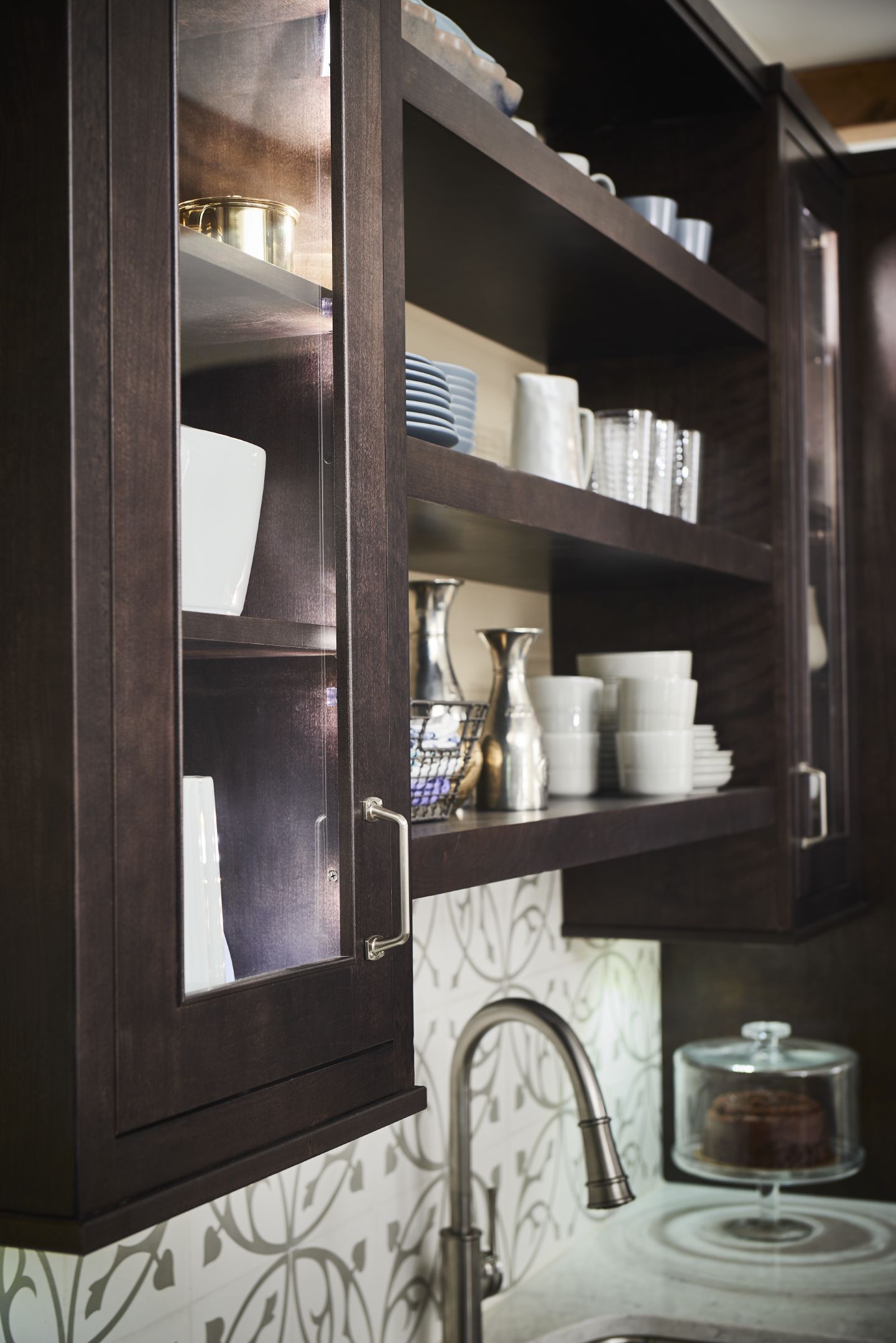Creating a comfortable yet chic kitchen is all about balance. In this design, the clean-lined hood, open shelves, and minimal Logan doors contribute to a contemporary, airy feel. The design is grounded by an earth-toned palette of blue, beige, and brown and organic elements such as the driftwood-inspired flooring and exposed wood beams.