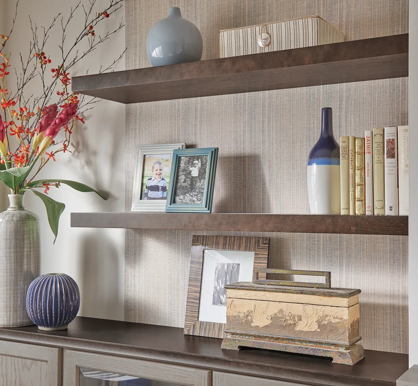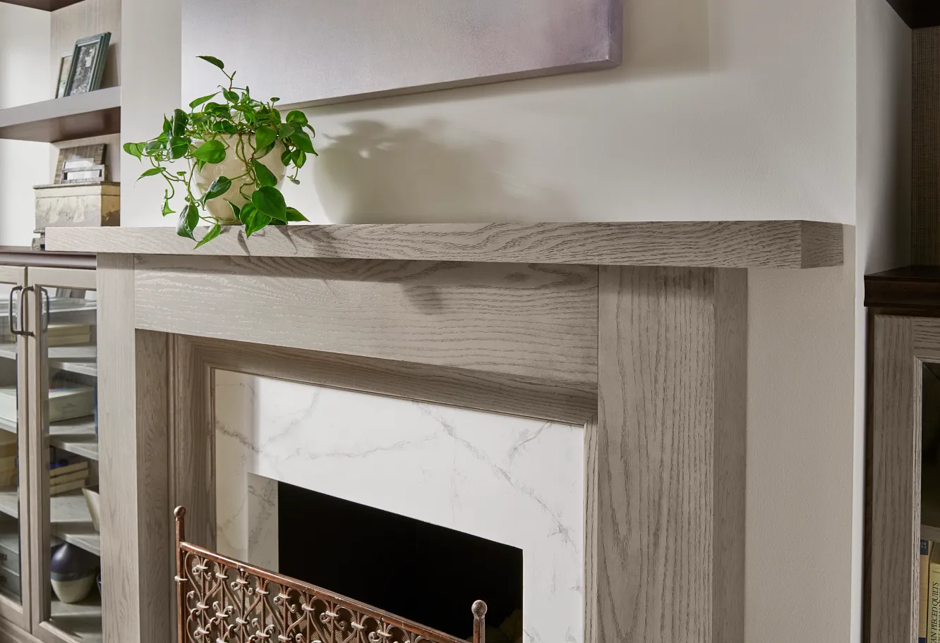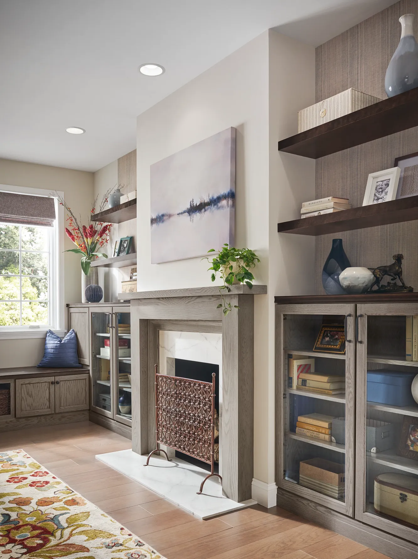 In this transitional design, we layered versatile neutral shades from cool Peppercorn wood stain to warm taupe wall paint.