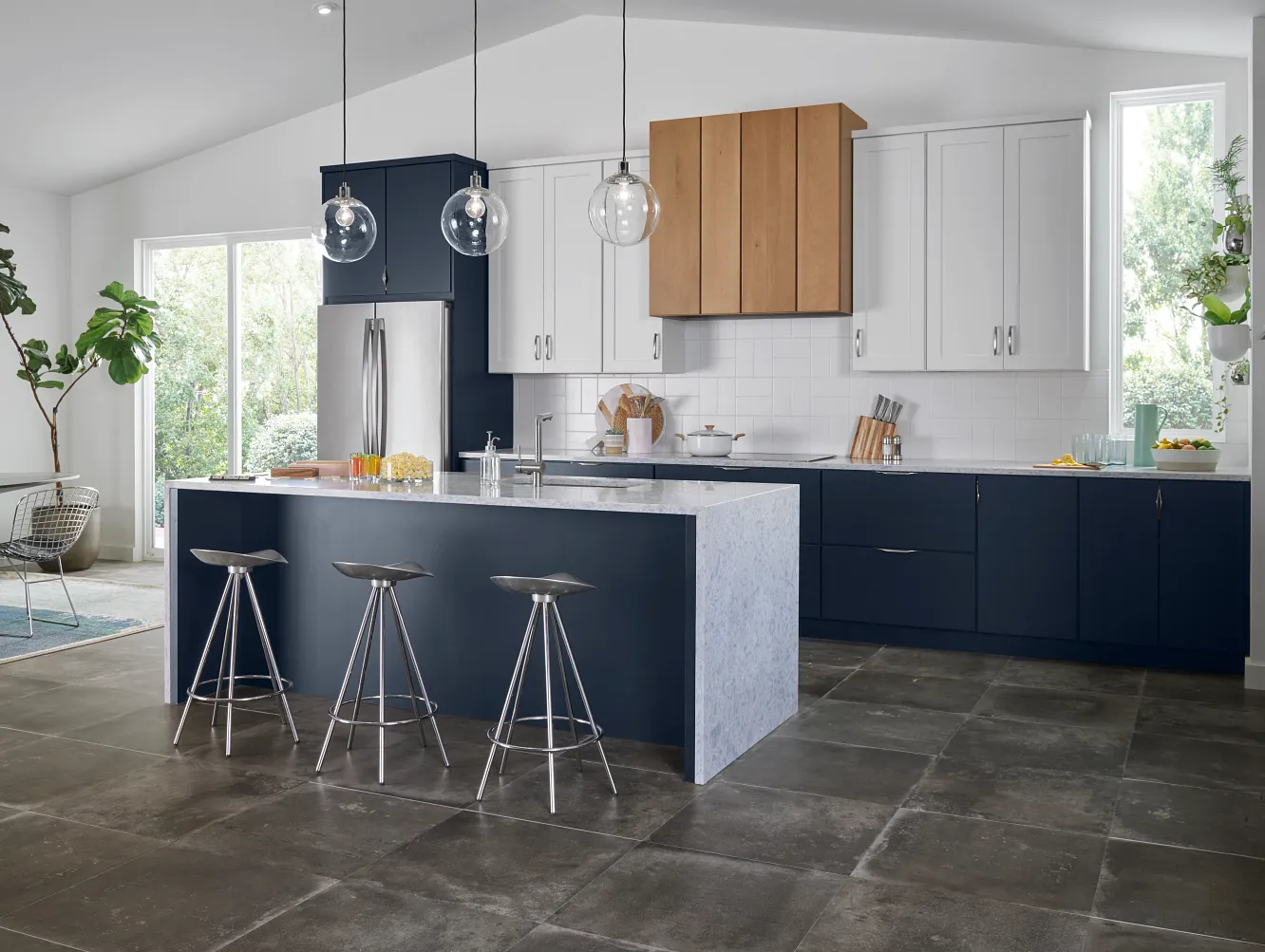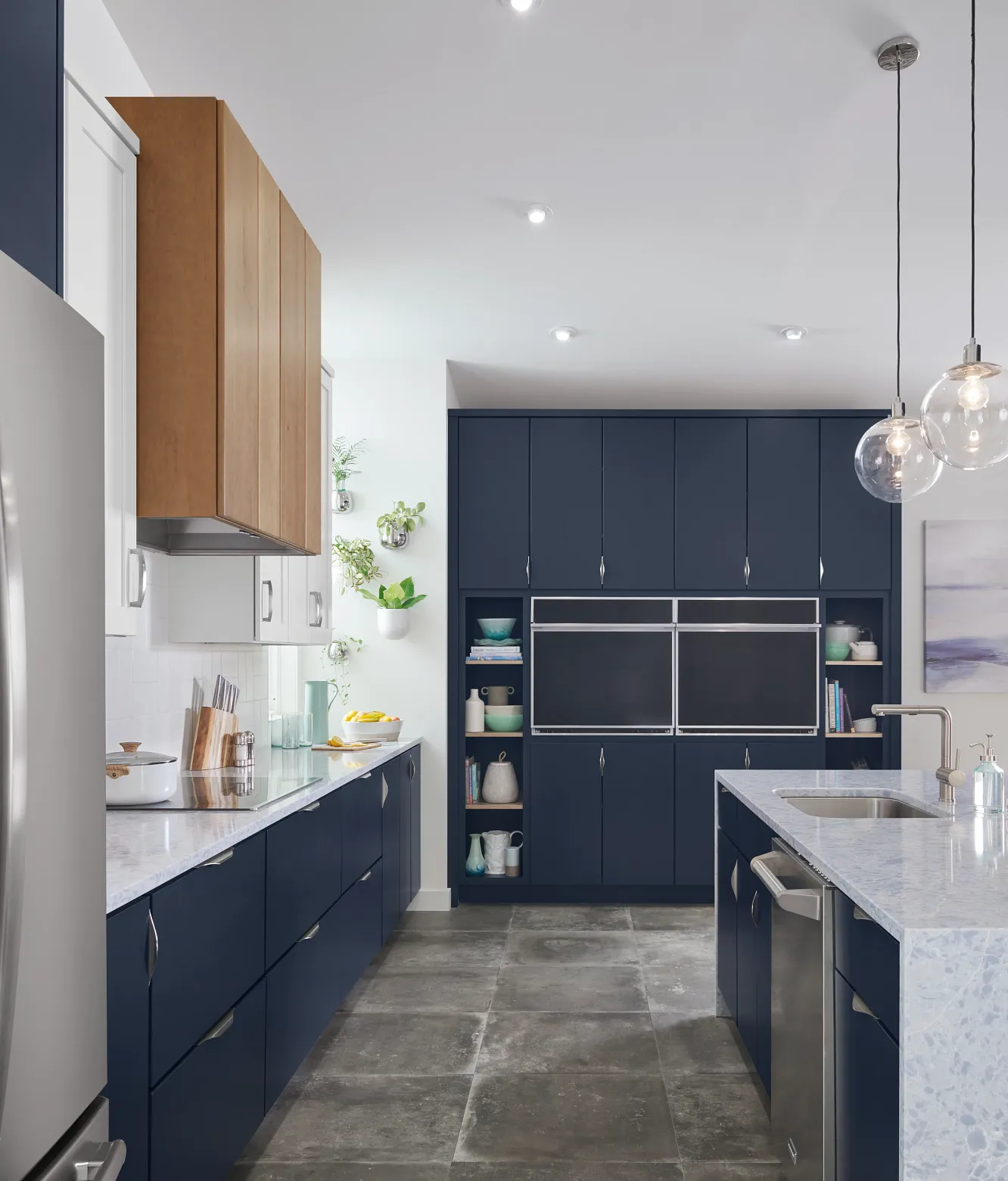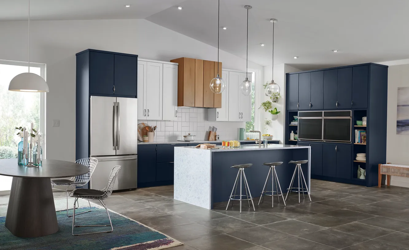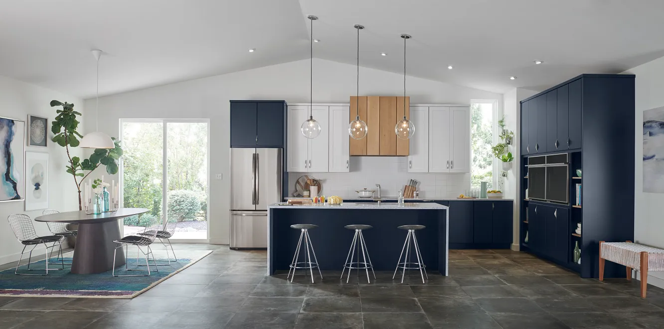 A study in complementarity, we paired bold Celeste paint with contrasting fresh Magnolia and neutral Biscotti stain in this on-trend kitchen.