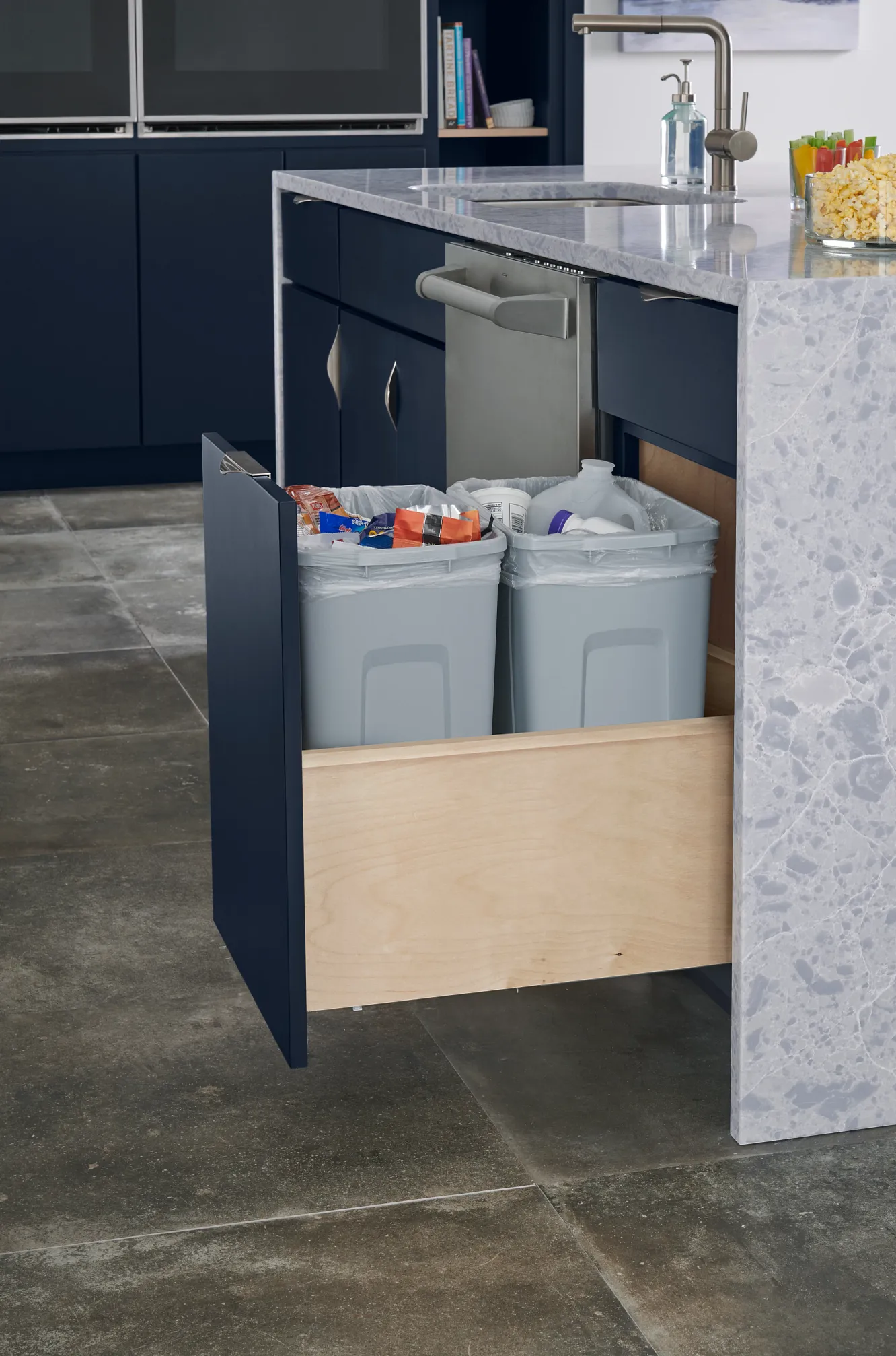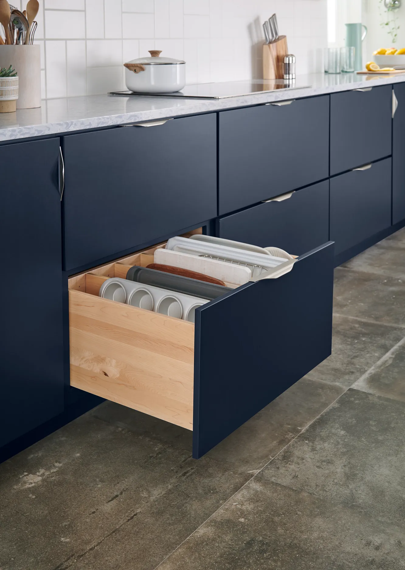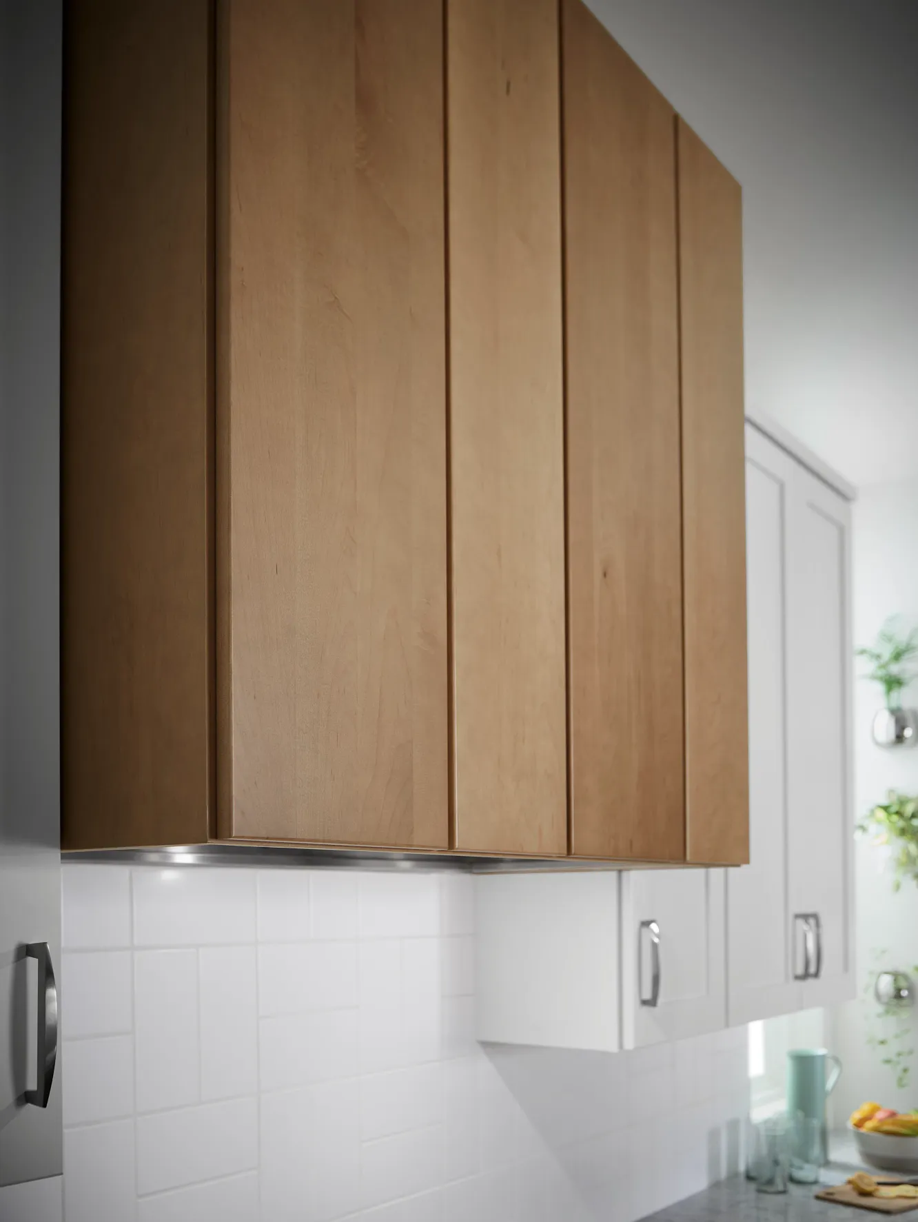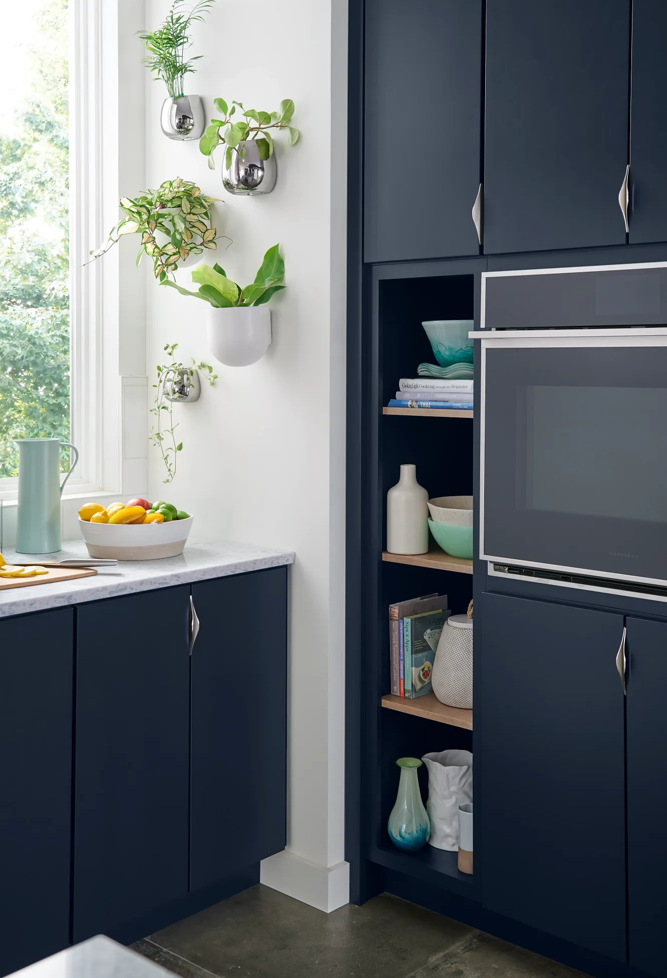 A study in complementarity, we paired bold Celeste paint with contrasting fresh Magnolia and neutral Biscotti stain in this on-trend kitchen.