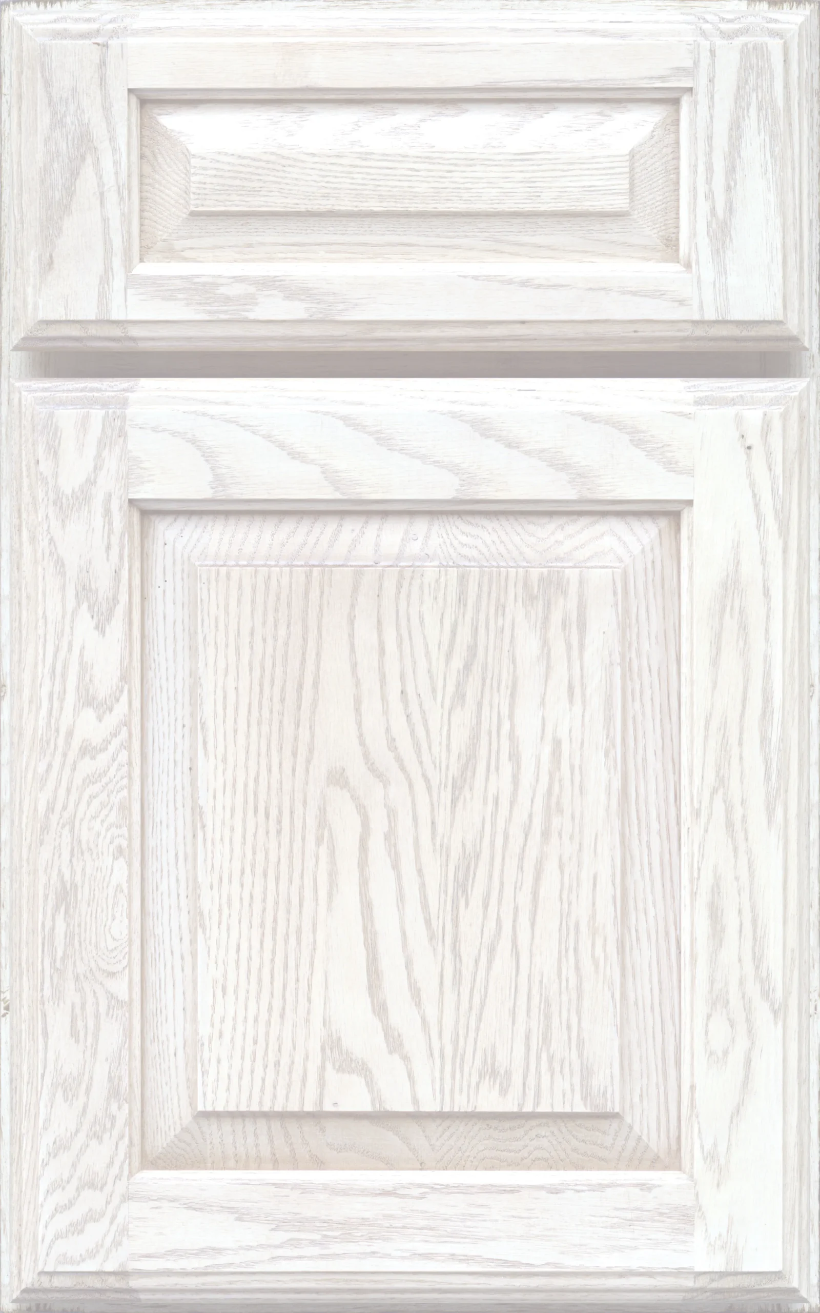 (Iconic) Crowley Raised Panel in Harbor Mist Sheer on maple and Cottage White Dry Brush on oak