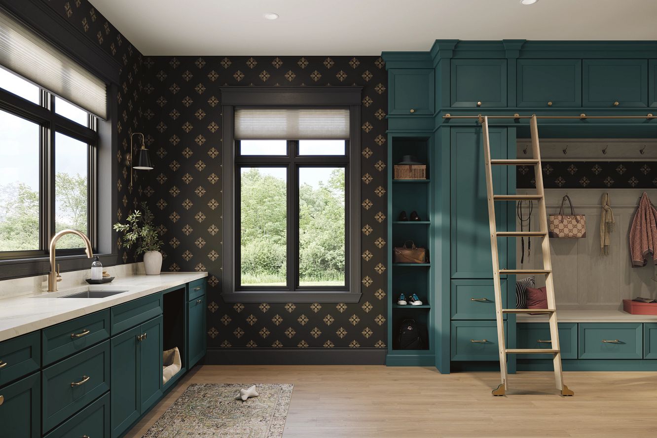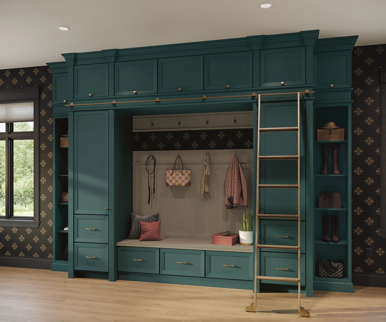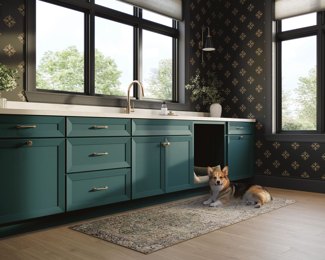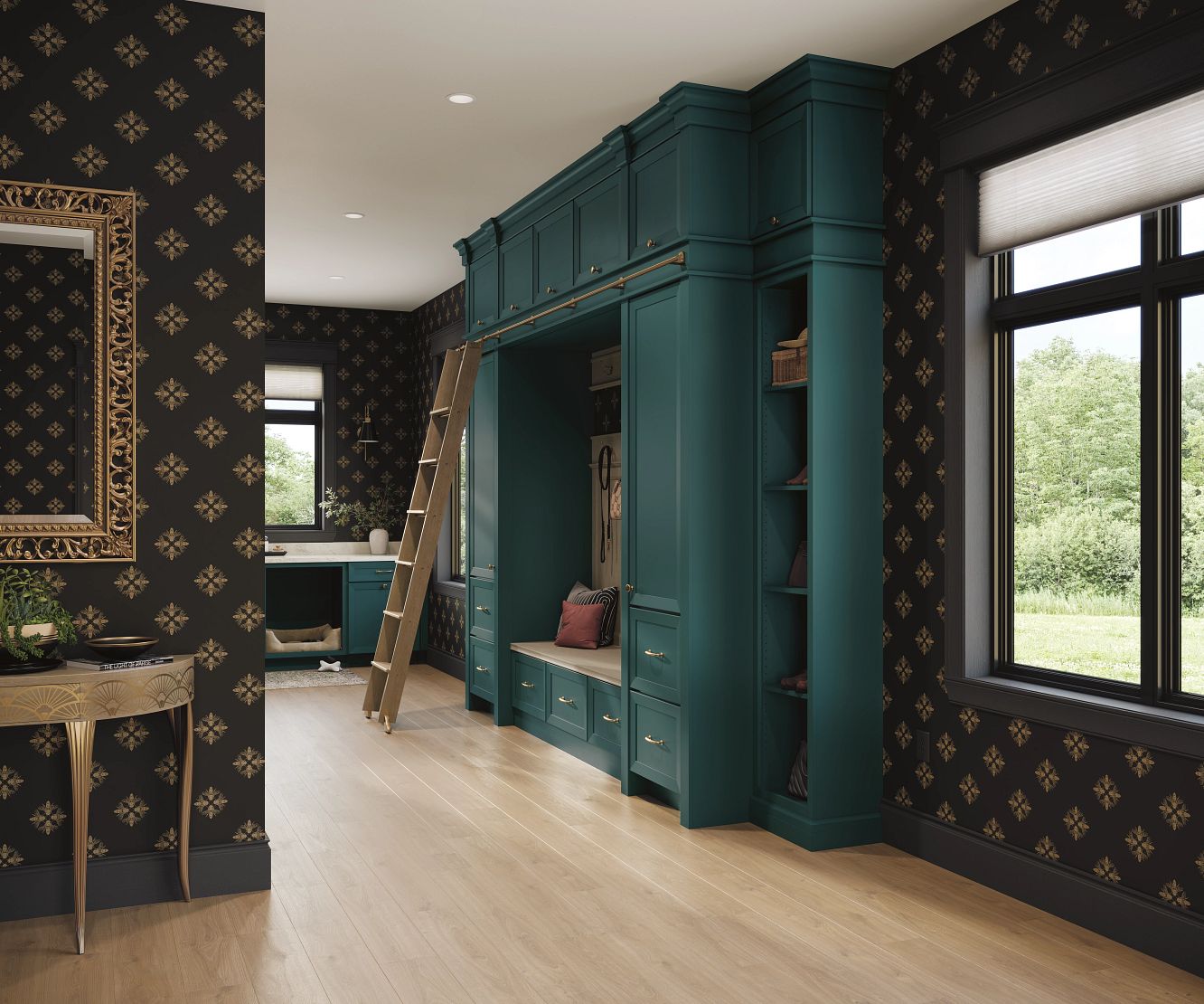 A refuge for ritual. In this transitional mudroom influenced by the seasoned sensibilities of Dark Academia, our new Haynes door shows off added nuance in stunning Ocean Jade. Floor-to-ceiling cabinetry, open cubbies, and a sprawling bench layout create organized landing zones for shoes, outerwear, equipment, and more, while our innovative Pet Food Station sits adjacent a cozy cutout offering sanctuary for household companions.