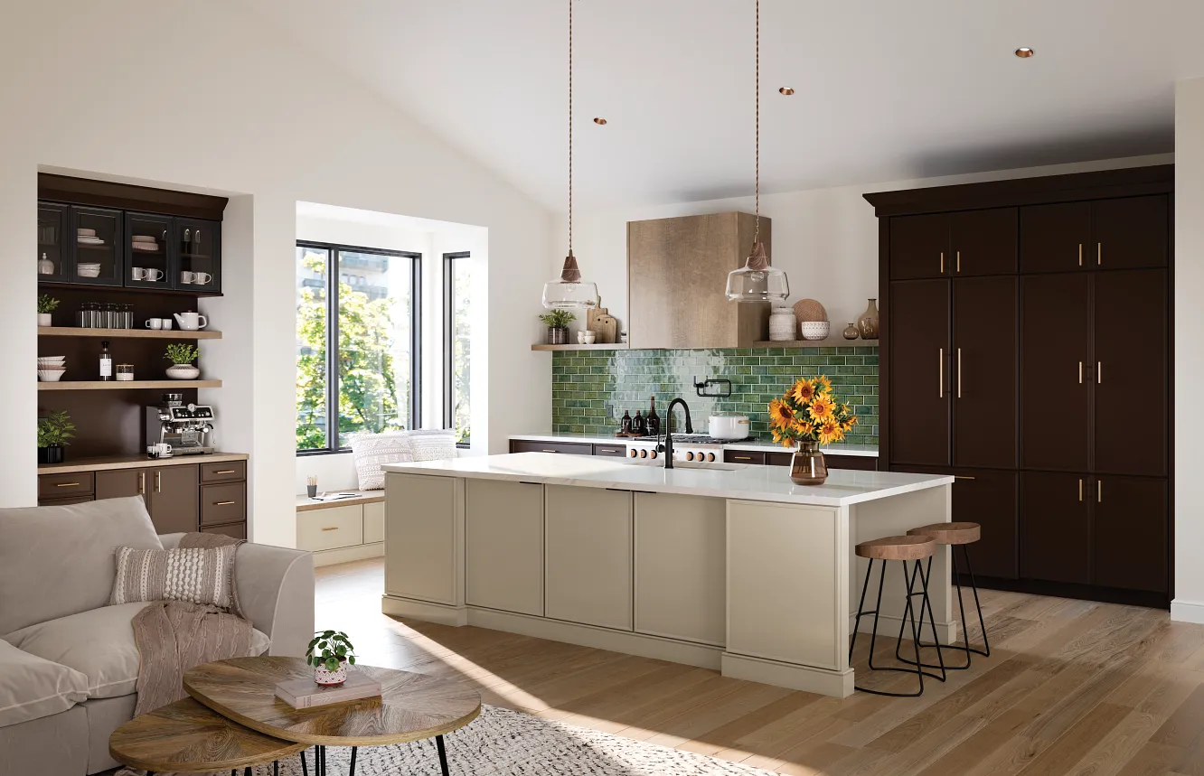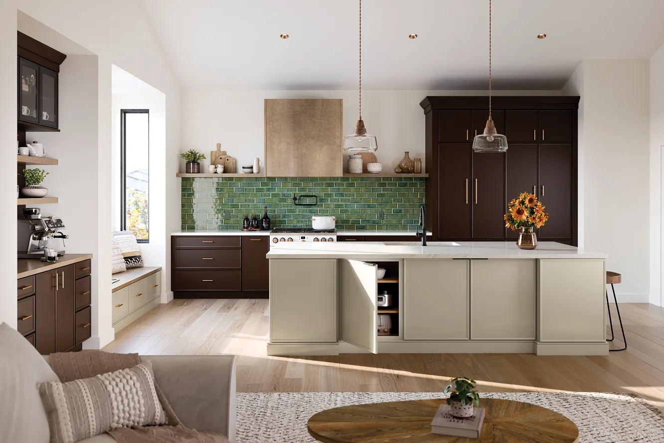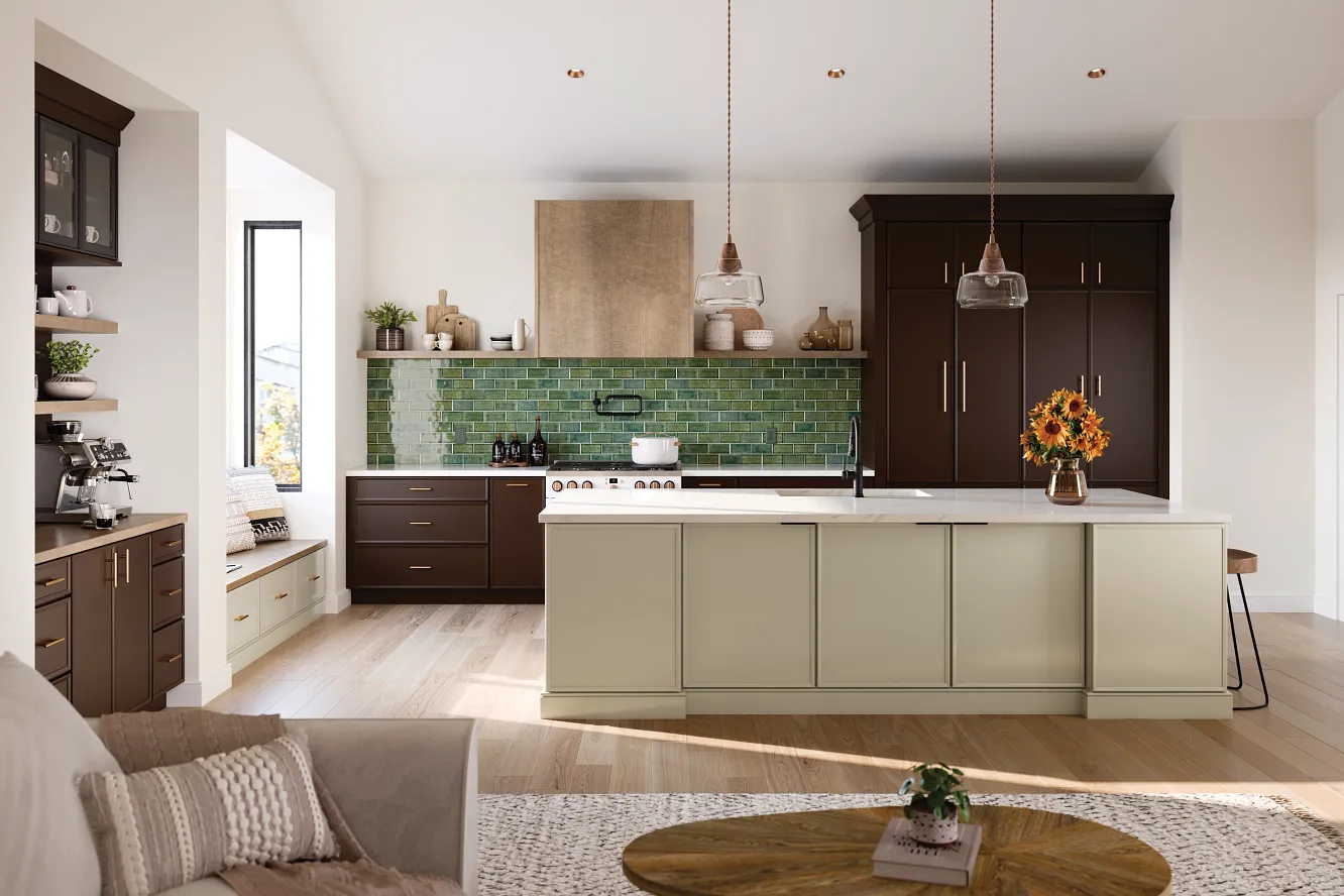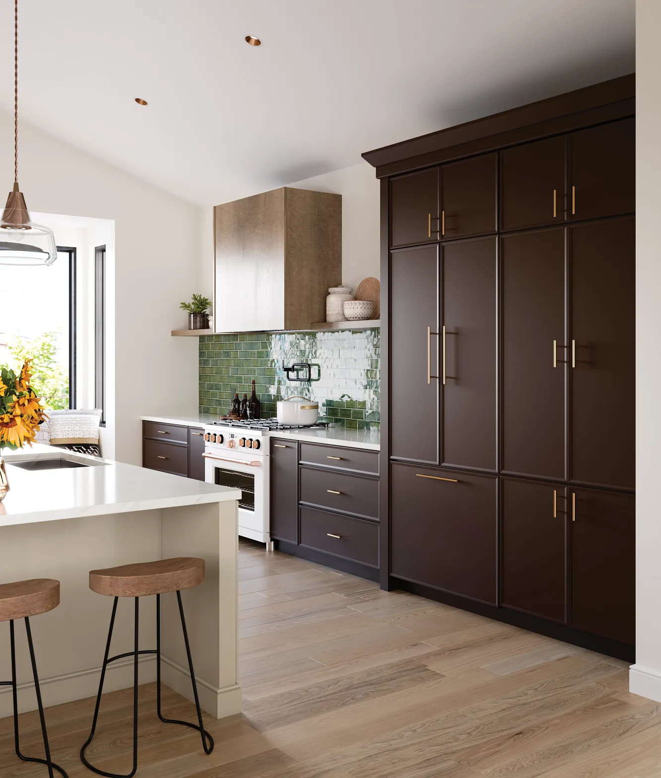 The lifelong search for “just right” may end here. This kitchen emphasizes the Organic Lagom trend which seeks to achieve balance through sustainable, socially conscious lifestyle choices. Favoring greenery, earth tones, elemental textures or fabrics, and meaningful items gathered on life’s journey, Organic Lagom cherishes a genuine connection to comfort. This room features our earthy and organic Coffee Break paint which brews up a brown so rich and dark it borders on black. The Cade door, with its thin frame, soft lines, and gradual bevel profile shows up not only in kitchen design features – offers a fashion-forward look in this trend-inspired setting.