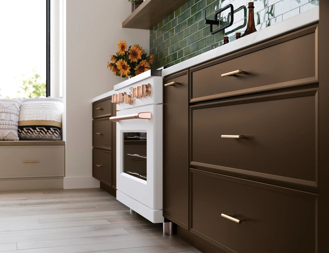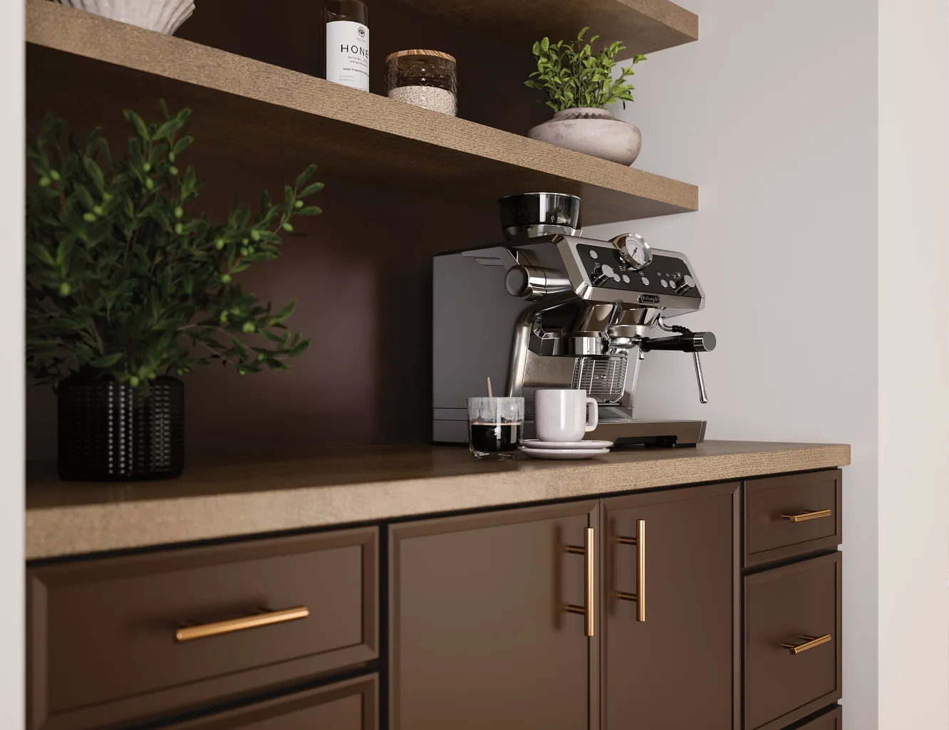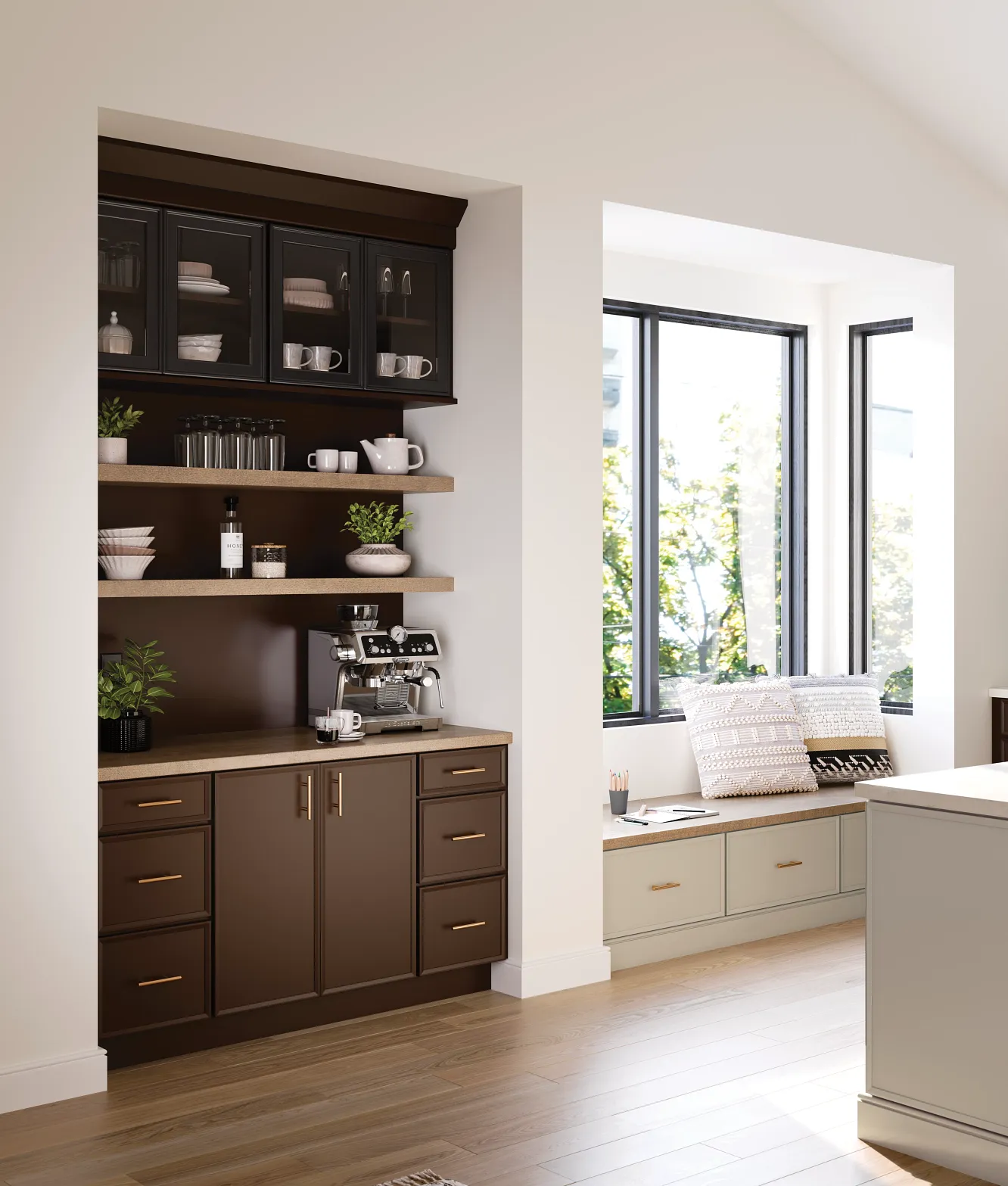 The lifelong search for “just right” may end here. This kitchen emphasizes the Organic Lagom trend which seeks to achieve balance through sustainable, socially conscious lifestyle choices. Favoring greenery, earth tones, elemental textures or fabrics, and meaningful items gathered on life’s journey, Organic Lagom cherishes a genuine connection to comfort. This room features our earthy and organic Coffee Break paint which brews up a brown so rich and dark it borders on black. The Cade door, with its thin frame, soft lines, and gradual bevel profile shows up not only in kitchen design features – offers a fashion-forward look in this trend-inspired setting.