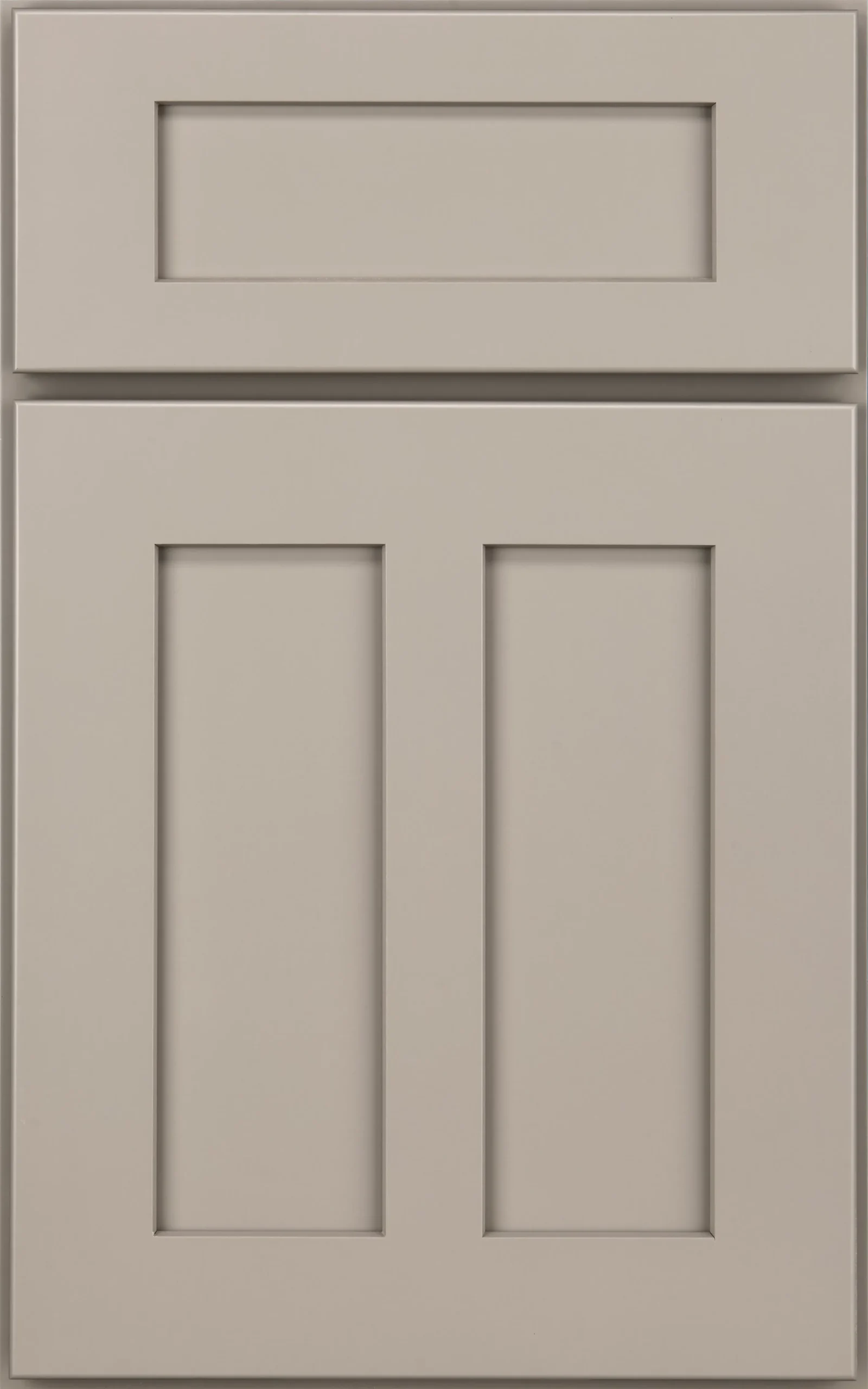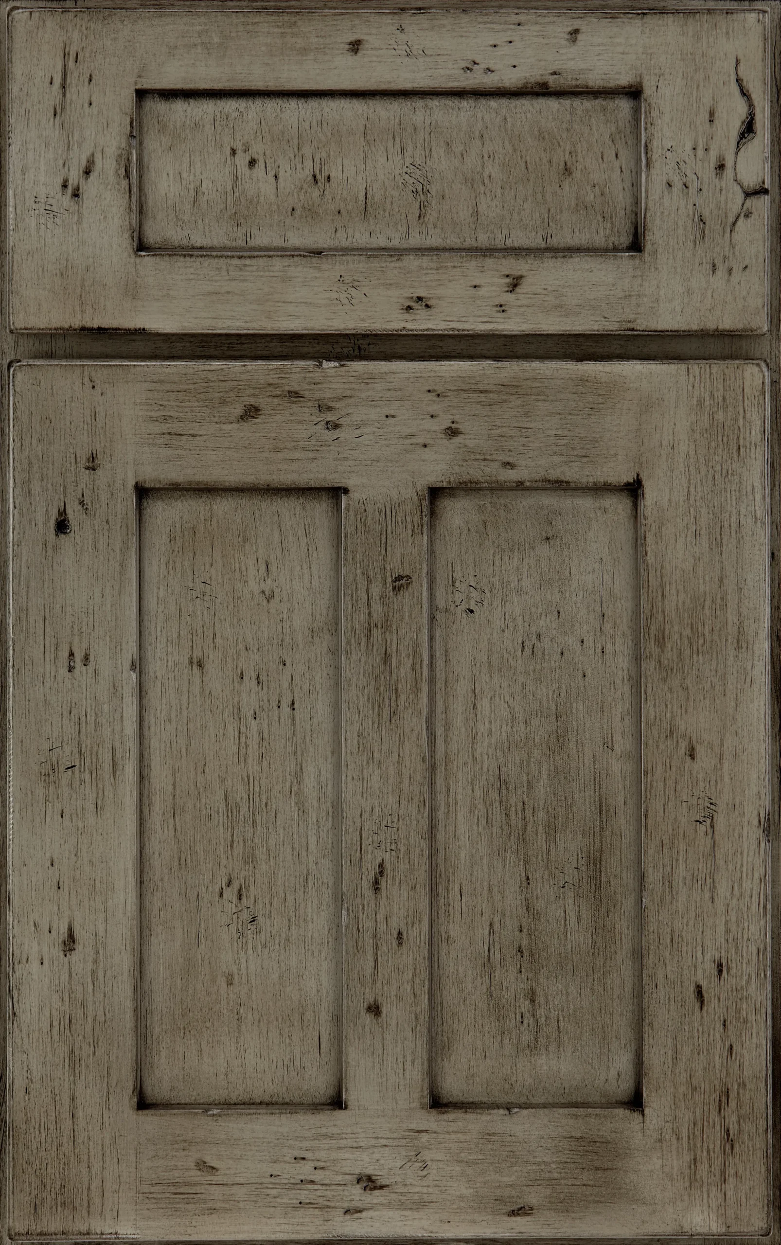 Split Shaker-style doors, understated moldings, the island’s rustic finish, and warm wood tones throughout evoke the feel of a comfortable country kitchen. We gave this style an on-trend twist with warm gray Macchiato paint in place of traditional white.