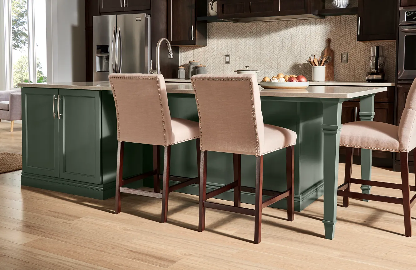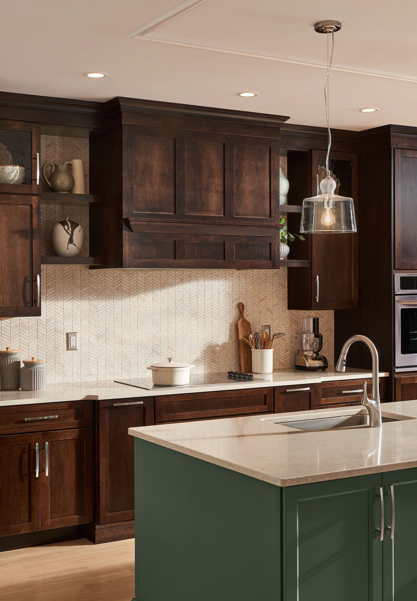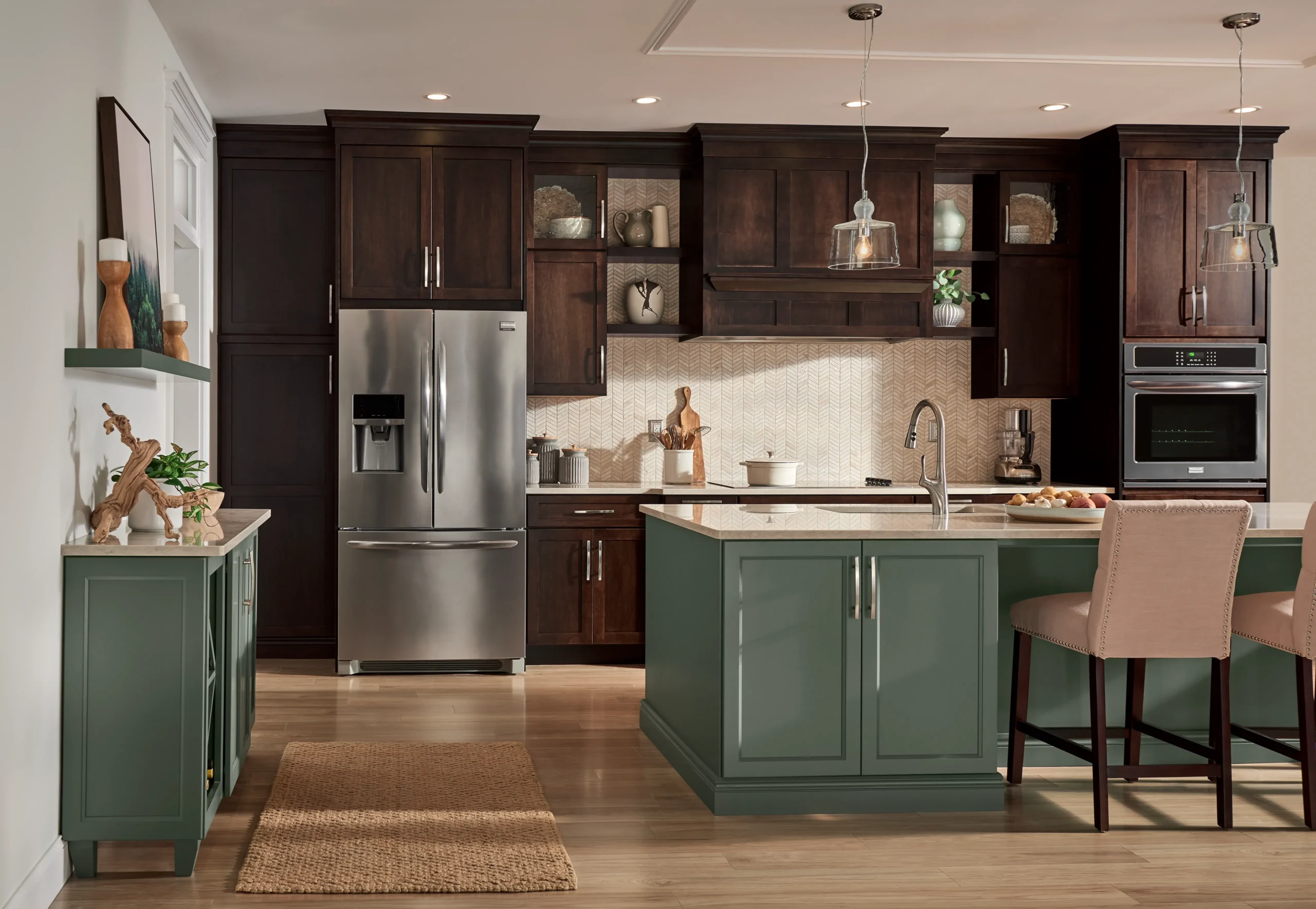 In this welcoming kitchen, we gave beloved traditional styling an on-trend update. Instead of using typical raised panel doors, we chose these timeless flat panel styles in fresh Eucalyptus paint and Espresso stain. Creative design solutions, like finding a way to make wall cabinets stretch to the ceiling, give the room a high-end feel while still being cost-conscious.
