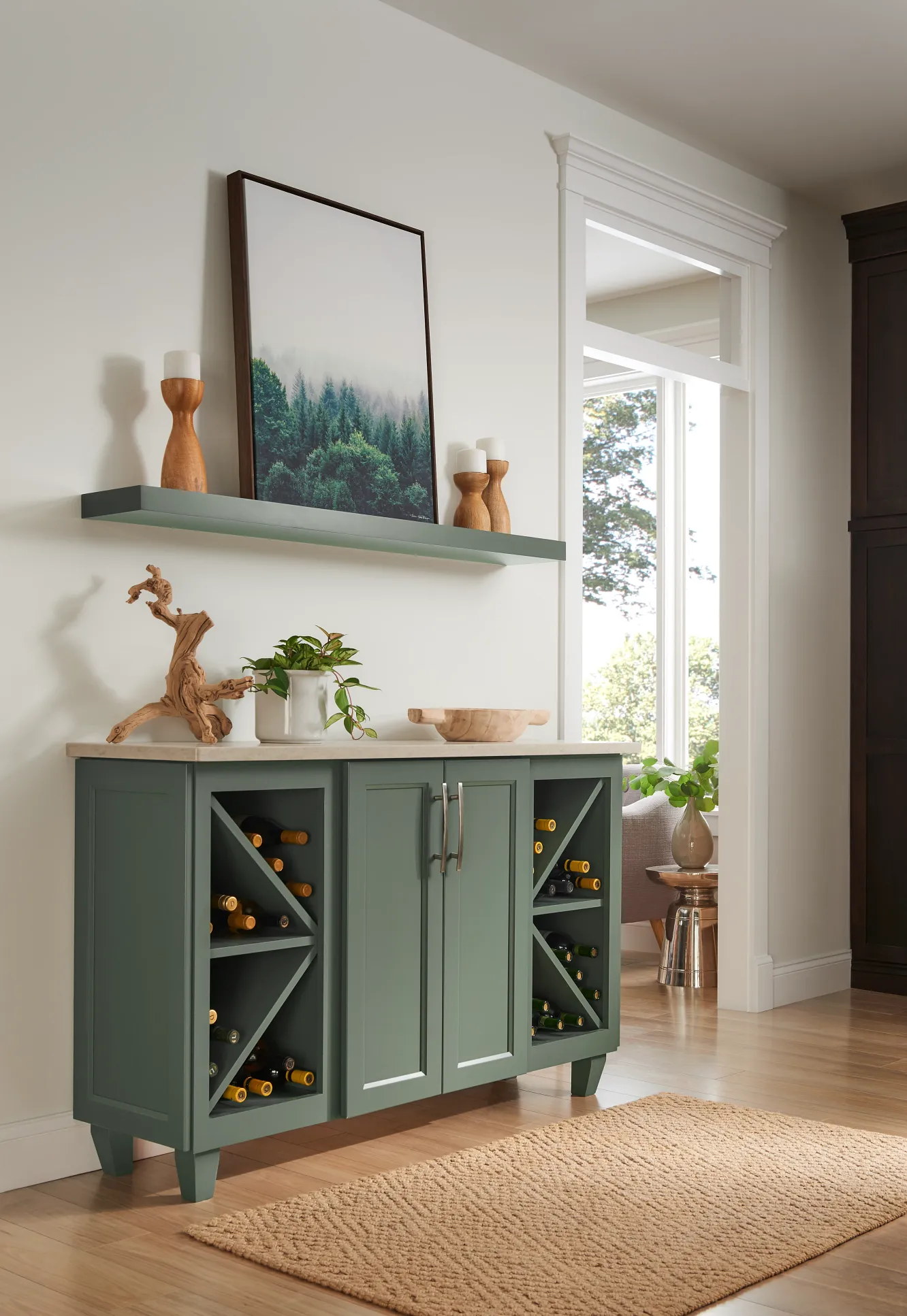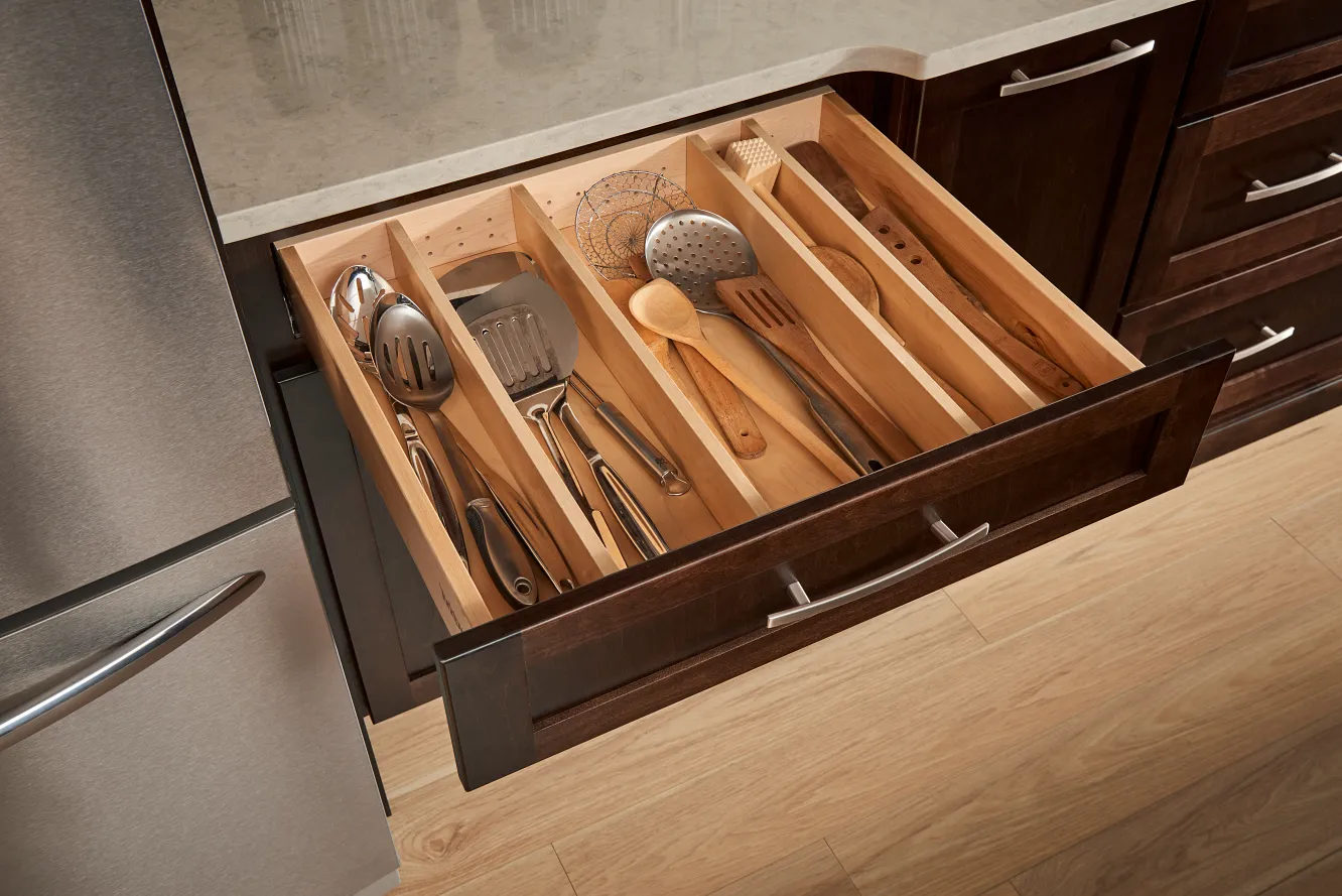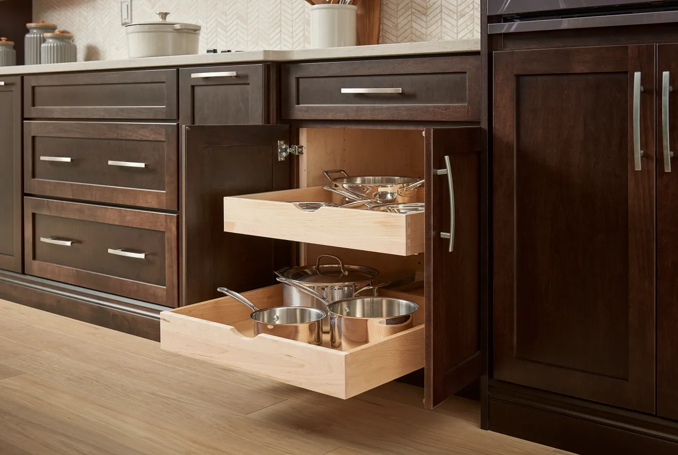 In this welcoming kitchen, we gave beloved traditional styling an on-trend update. Instead of using typical raised panel doors, we chose these timeless flat panel styles in fresh Eucalyptus paint and Espresso stain. Creative design solutions, like finding a way to make wall cabinets stretch to the ceiling, give the room a high-end feel while still being cost-conscious.